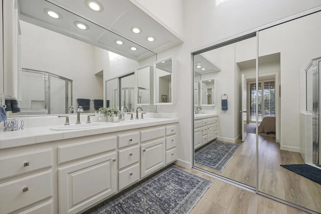 Fabulous lagoon location! Soak up the sun on your south facing patio and watch all the wonderful wildlife that the lakes attracts. This Cheyenne model offers an open floorplan as the kitchen over looks the very useable courtyard and the dining and living room are open to each other. Two primary bedrooms with adjoining baths, complete this very light and bright unit. It just feels like home, with new paint, new floors, paver driveway and courtyard, new heat pump installed this week! This unit should be awarded best use of space. Located in The Lakes Country Club with 27 holes of championship golf, incredible practice areas, an amazing new clubhouse and a sensational state of the art fitness center and spa. 44 pools and spas. Bocce ball, Racquet Center with Pickle ball, tennis and pop tennis courts. It is an incredible place to live.