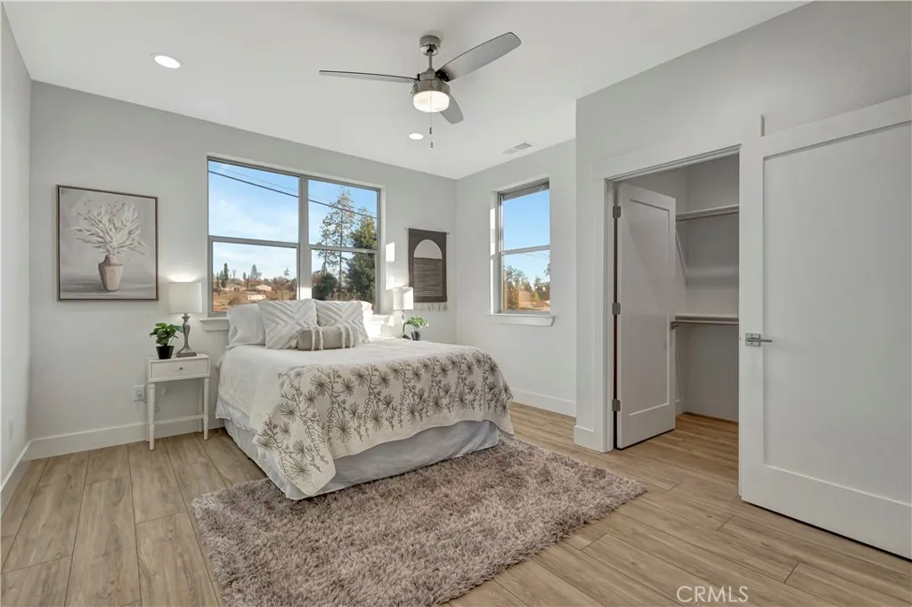 QUIET NEIGHBORHOOD BY BILLE PARK & 15 MINUTE COMMUTE TO CHICO! This 3-bed, 2.5-bath beauty offers elegant living space that is nestled on just over a half-acre with a landscaped front yard, side yard RV access, covered front porch and large covered back deck with views to the coast range & valley. As you enter the house, you are greeted by a grand living space filled with an abundance of natural light streaming through large windows. The beamed ceilings add depth and character to the space & the gas fireplace creates a cozy and welcoming ambiance. The gourmet kitchen is a culinary enthusiast's dream comes true and is equipped with soft close drawers, top-of-the-line stainless steel GE Cafe brand appliances and a large walk-in pantry you will love! The quartz countertops provide ample space for meal preparation, room for counter-top appliances and a large center island with seating access! The sliding glass doors lead you to the covered back deck, complete with two outdoor ceiling fans, providing beautiful views to the valley and amazing sunsets, blending indoor and outdoor living! Whether you're enjoying a morning cup of coffee or hosting a summer barbecue, this space is perfect for relaxing and entertaining alike. Designed with comfort and privacy in mind, this home boasts a split floor plan, placing the primary bedroom on the opposite side of the house from the guest bedrooms. Your primary bedroom is a sanctuary that offers a tranquil retreat with ample space & large walk-in closet. The en-suite bathroom features a luxurious walk-in shower, separate soaking tub, double sinks and modern fixtures. Adjacent to the primary suite, is the laundry room specially designed for your space saving stackable washer and dryer featuring both natural gas and electric dryer hookups as well as lots of cabinets & countertop space and a utility sink. The guest bedrooms are thoughtfully designed, each with its own walk-in closet, ceiling fan, and large windows for an airy and comfortable feel. Sharing a convenient Jack and Jill bathroom between them with a semi-private vanity & sink area and a fully private bathroom space for privacy and comfort. Additionally, there is a 1/2 bathroom for your visiting guests off the living room. The large yard features a seasonal creek in the back, plenty of RV & extra parking, lots of room for gardening as well as room to create your own dream yard design! Only 1 mile from Bille Park, downtown Paradise and a quick 12 Mile drive to Chico!
