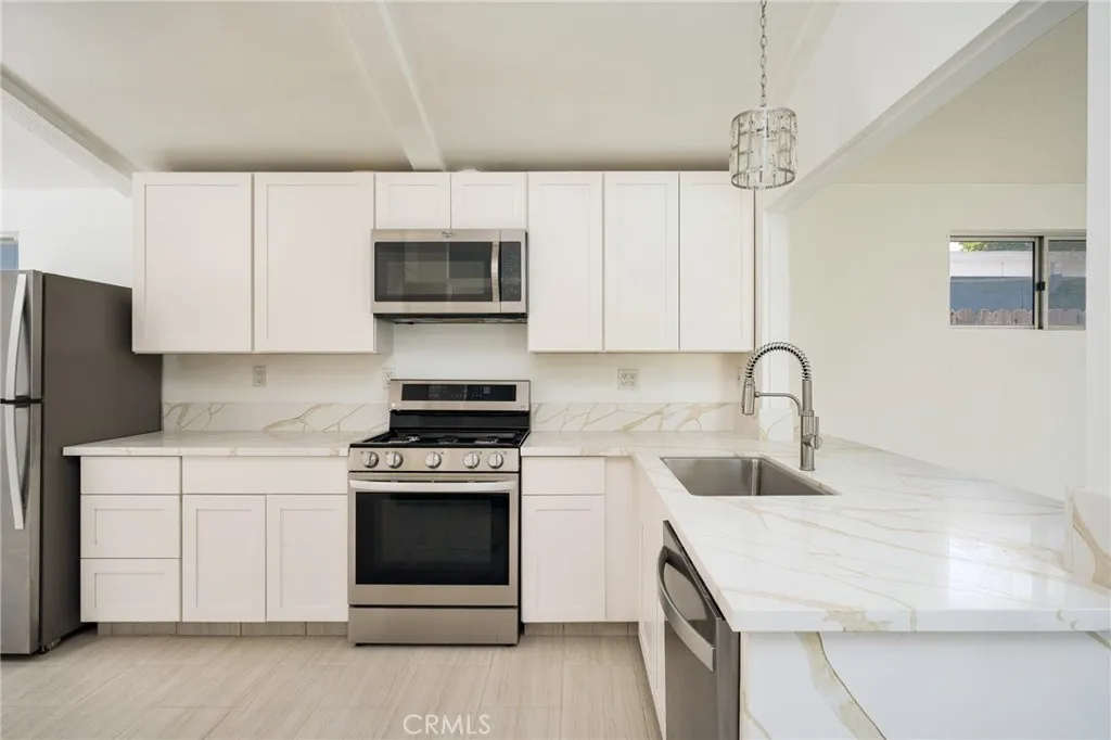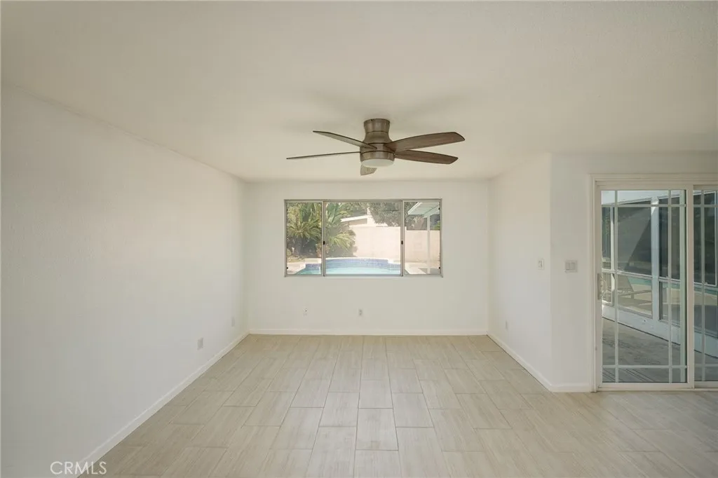 Beautifully remodeled single-level home in a cul-de-sac location offering approximately 1,800 square feet of comfortable living space. The updated kitchen features stainless steel appliances, a 5-burner range, farmhouse sink, dishwasher, and refrigerator, along with new tile flooring and updated light fixtures. The home offers two spacious living areas and a dining space, with ceiling fans, newer light fixtures, and laminate wood flooring in the bedrooms throughout. The extra-large primary suite includes a walk-in closet and updated bathroom with a modern shower and upgraded sink cabinetry. Enjoy the backyard with a heated pool and spa, perfect for relaxing or entertaining in the Southern California sunshine.