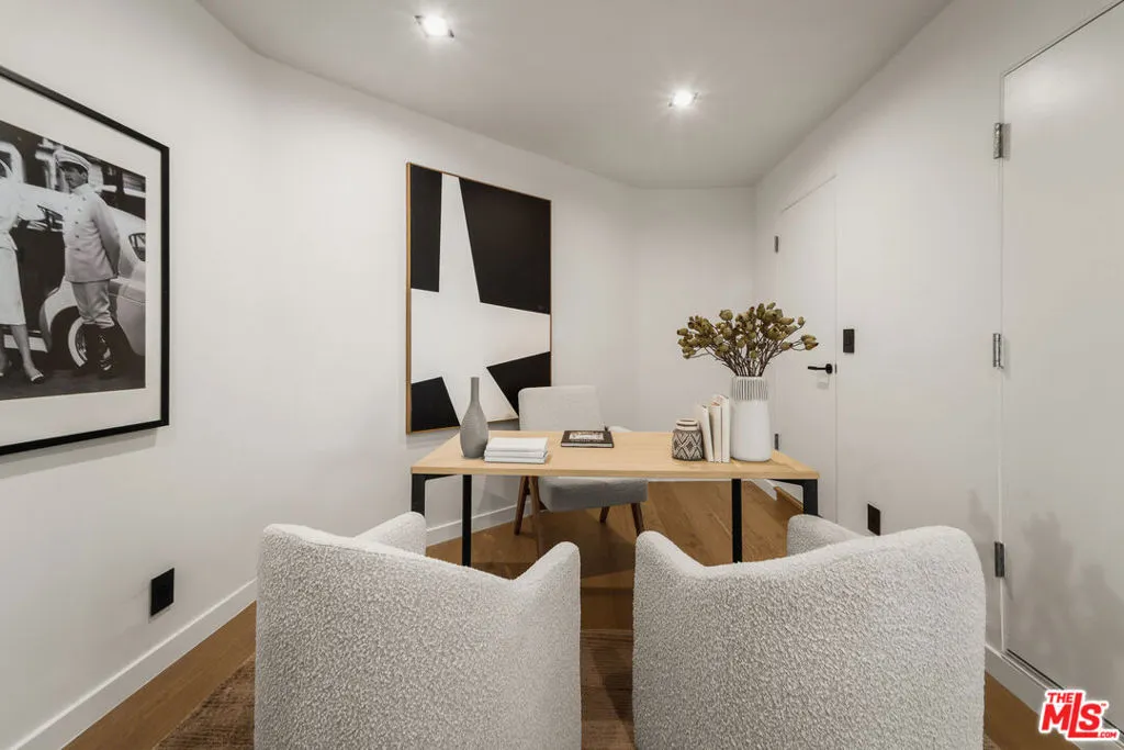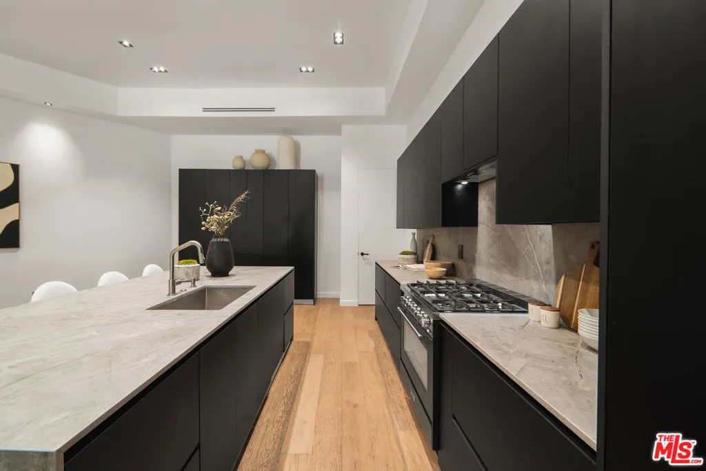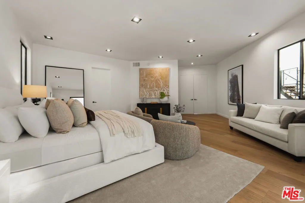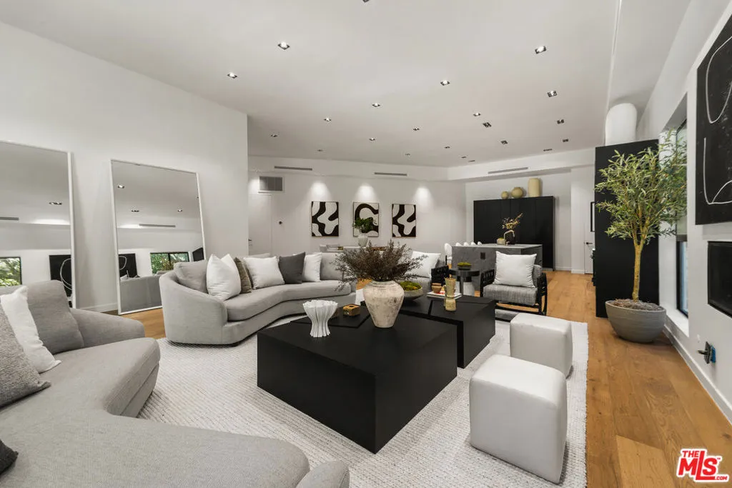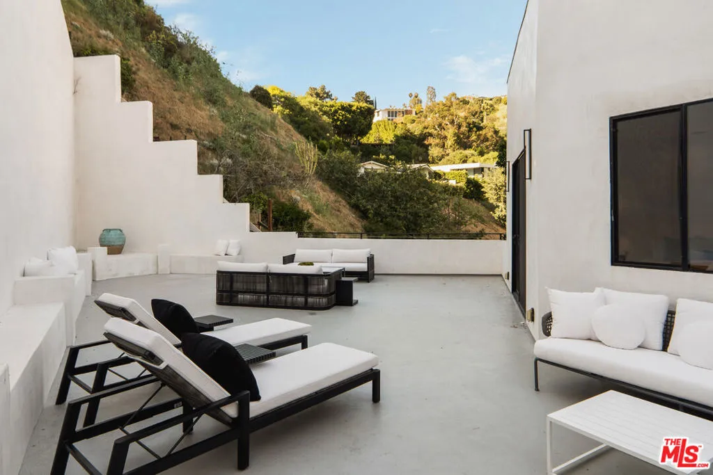 Meticulously renovated and masterfully reimagined, this exceptional modern residence in coveted Outpost Estates captures the essence of elevated Hollywood Hills living. Bathed in natural light, the main level features an expansive open-concept layout anchored by soaring 12-foot ceilings, seamlessly connecting the kitchen, dining, and living spaces--perfect for both refined entertaining and effortless everyday living. The chef's kitchen is a true showpiece, appointed with designer appliances, bespoke cabinetry, and striking Cosentino Dekton countertops. A chic powder room and a private guest suite with its own entrance complete the main floor, offering both versatility and comfort for visitors or extended stays. Upstairs, the stunning primary suite serves as a serene retreat, complete with direct access to one of two outdoor living spaces. Two additional en-suite bedrooms and a well-appointed laundry room complete the second level. At the pinnacle of the home, an expansive rooftop deck showcases sweeping canyon vistas and dazzling city-light views--an unforgettable backdrop for sunset gatherings or quiet evenings under the stars. A rare offering that seamlessly blends modern design, luxury finishes, and an unbeatable location.