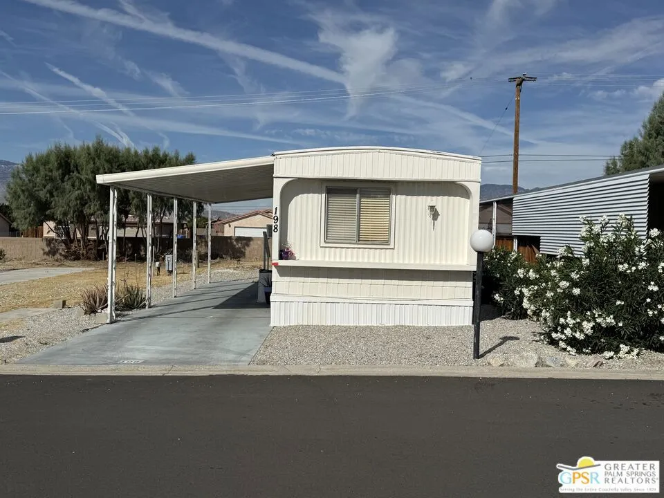 Come see this charming 2 bed, 2 bath home available in Hidden Springs Country Club, a 55+ active community in Desert Hot Springs. This bright and airy unit boasts a large living area and dining area with built in hutch. There is ample storage in the galley kitchen, and a separate laundry area with washer and dryer. The spacious primary bedroom includes an en suite bath with deep sunken tub. There is an additional bedroom and with an adjoining bath. Enjoy scenic mountain views from the south facing windows. Lots of covered parking and a large detached shed complete the package. Community amenities include tennis and pickleball courts, a sauna, a large swimming pool, two hot tubs, clubhouse complete with gym, pool table, and meeting area, and a dog park for your furry family members. Be sure to take a look at this one.