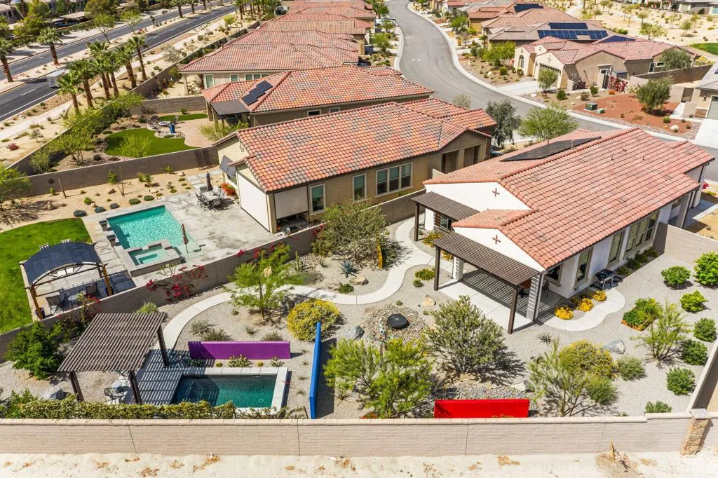 This immaculately maintained Getaway model has operated as a successful seasonal rental and is offered completely turnkey including all furnishings and decor, electronics, kitchenware and bed/bath linens, making it ideal as a move-in ready primary residence, seasonal retreat, or income-producing investment. Positioned on a deep oversized lot with no neighboring homes on one side or behind, the property offers a rare sense of privacy and openness. The south-facing backyard is a true standout that features custom desert landscaping, a contemporary water feature, a colorful metal and glass sculpture, and a curved walkway that leads to a private heated plunge pool. Both the patio and pool seating area are covered with durable Aluma-wood structures. Inside, the 2-bed, 2-bath residence is tastefully appointed with high quality furnishings and thoughtful design details. Generous windows provide abundant natural light throughout. Notable enhancements include red oak wood flooring, upgraded cabinetry and hardware, upgraded appliance package, quartz countertops, numerous custom accents, a multi-zone sound system, and more! Additionally, the home was constructed with an enhanced energy package, featuring upgraded HVAC and water heater, and an insulated garage. Owned solar and a dedicated 220V electric vehicle charging circuit complete this exceptional offering. Del Webb Rancho Mirage features first-class amenities including community pools and spa, tennis and pickleball, stunning clubhouse with social activities, and HOA services that include cable and internet, 24/7 security, and common area maintenance.