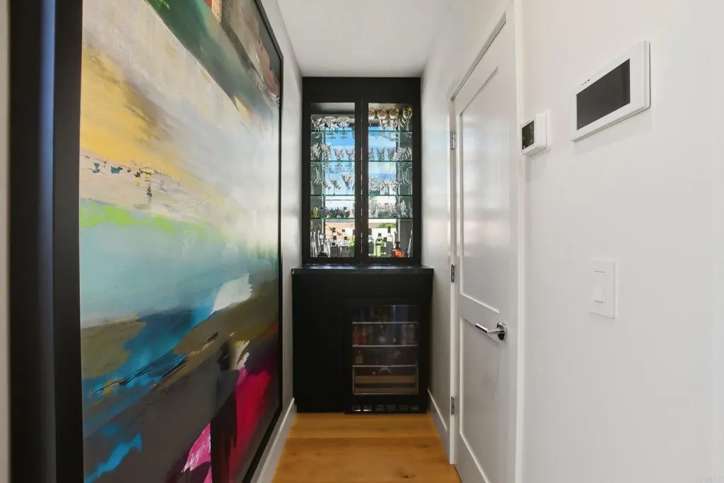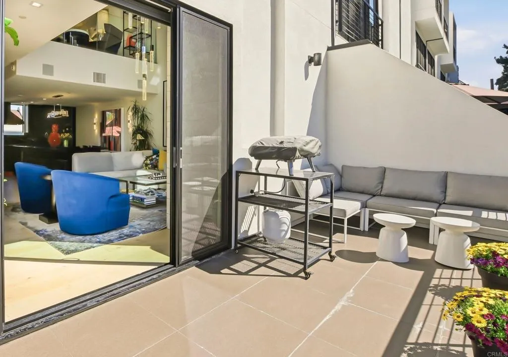 Positioned between two of San Diego’s most vibrant neighborhoods, Hillcrest and Bankers Hill, this architecturally striking corner residence and former model home has been extensively customized by its current owner. Access the residence through one of two secured pedestrian gates or the attached two-car garage. The entry level features a bedroom with an ensuite bathroom. The second floor serves as the social center of the home. The kitchen is anchored by a dramatic island wrapped in honed Starry Night Brazilian quartzite, designed for both meal prep and dining. Professional appliances include a Wolf five-burner gas cooktop, Miele convection oven, microwave, dishwasher and built-in coffee machine, custom Vent-A-Hood, The Galley sink, and Sub-Zero refrigerator. Dual Sub-Zero freezer drawers with ice maker and a Monogram Reserve wine refrigerator are integrated into the island. The living room features a gas fireplace, built-in storage with illuminated shelving, and a chandelier highlighting the two-story volume. A built-in bar with a second wine refrigerator and a powder room enhances entertaining. The large balcony extends the living space outdoors. The third level offers a loft with built-in credenza and a full bathroom, currently used as an office with potential for a third bedroom. The top level is dedicated to the primary suite, featuring a gas fireplace, custom built-ins, walk-in closet, gorgeous bathroom, laundry closet and multiple balconies. Additional upgrades include Du Chateau flooring, automated shades, whole-house sound with security, water softener and reverse osmosis system, Navien tankless water heater, and a new HVAC system with integrated air purification. Located in Quinteza, a five-unit detached condominium community along the parade route to Balboa Park, the home offers a unique vantage point for events. Park the car and enjoy one of San Diego’s most walkable locations.
