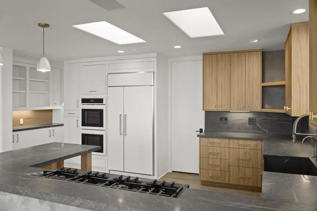 Spectacular North Shore ocean views await at this newly remodeled La Jolla Hills home. Designed like a contemporary treehouse nestled among mature trees, the home offers a serene, private setting. Recent upgrades include all-new windows, appliances, interior and exterior paint, refreshed decks and upgraded baths. With seamless indoor/outdoor flown and multiple gathering spaces, the reimagined home is ideal for families who love to entertain.