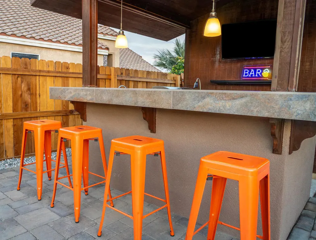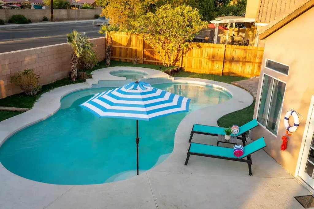 Welcome to this stunning 5-bedroom, 3-bath home offering over 2,200 sq. ft. of beautifully designed living space. This turnkey, fully furnished and equipped residence is perfectly situated in a prime Indio Central location with no HOA, blending modern comfort, style, and exceptional investment potential.Step inside to a welcoming main floor featuring a spacious family room that flows seamlessly into the delightful kitchen. The kitchen offers an island with recessed lighting, ample counter space, and a cozy dining area where you can enjoy the warmth of the fireplace during cooler winter evenings.The second floor features four well-appointed bedrooms and two updated modern bathrooms. The elegant primary suite opens to a private balcony--an ideal spot to unwind and take in breathtaking sunsets and mountain views.Your backyard oasis truly lives up to its name: ''Fun in the Sun.'' Enjoy a sparkling saltwater pool and spa, perfect for refreshing dips or relaxing soaks. Entertain with ease using the built-in barbecue grill, outdoor TV, and comfortable poolside seating--an ideal setup for gatherings with friends and family.A dream for investors and homeowners alike. Whether you're seeking a full-time residence, a vacation retreat, or a short-term rental opportunity, this home is ready to perform. Owners had good revenue on Airbnb in 2025. Sold furnished or unfurnished--your choice.Located near world-renowned attractions including the Indian Wells Tennis Garden, Festival Fairgrounds, Acrisure Arena, top-rated restaurants, and premier shopping destinations.Buyers win--this charming, income-producing home is ready for you. Bring your offer and step into a thriving business or your next beautiful home.