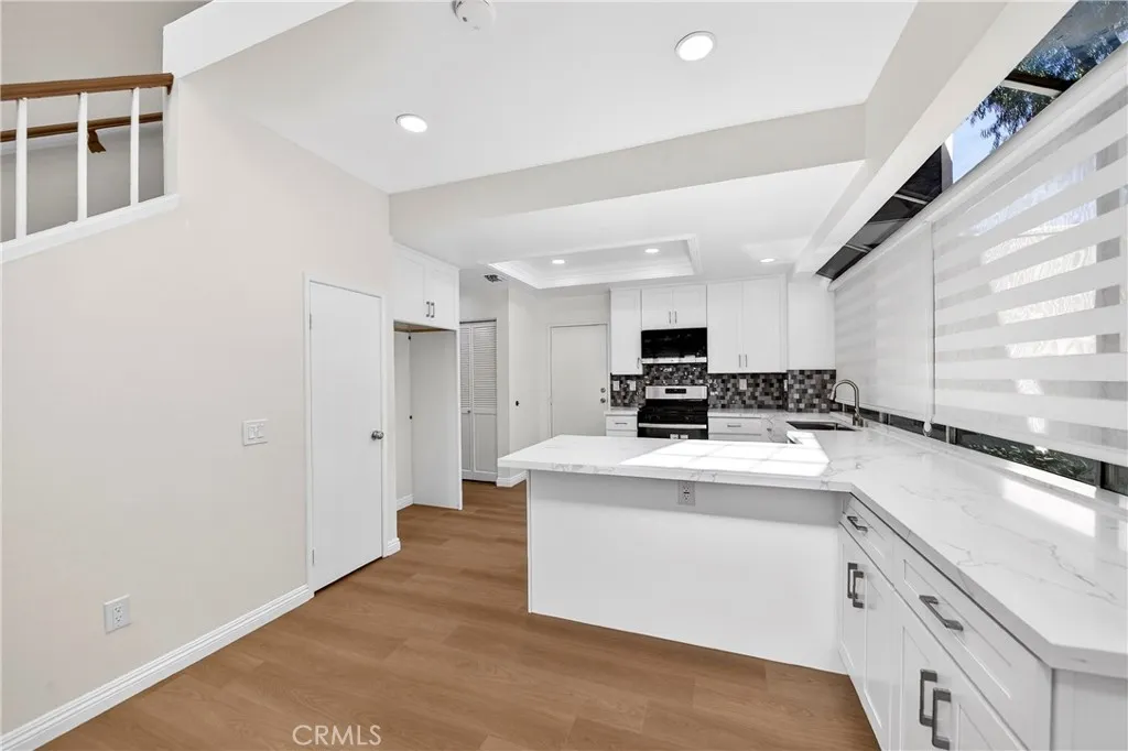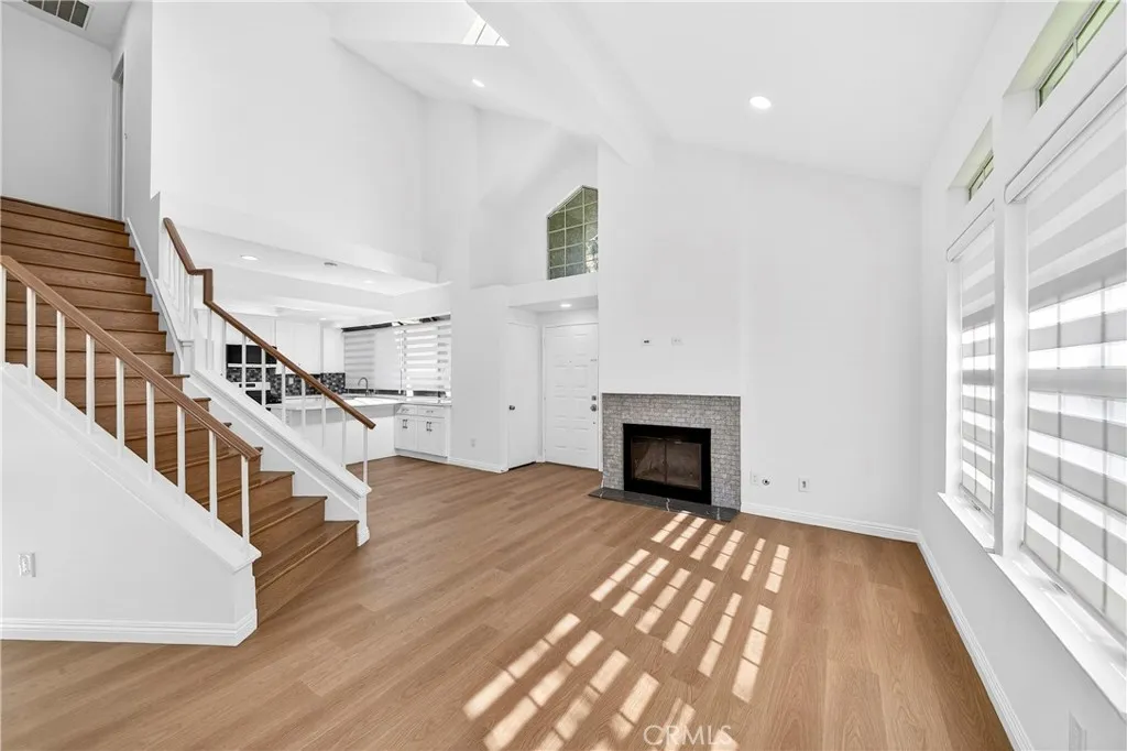 THE GLEN" IS TRULY ONE OF THE MOST DESIRABLE NEIGHBORHOODS IN LA MIRADA'S HILLSBOROUGH COMMUNITY. This highly desirable three-bedroom, two-bathroom condo is move-in ready and offers all the updates you are seeking, including a one-bedroom downstairs. Upstairs, you will find two spacious bedrooms with a brand-new Jack and Jill bathroom. Upon entering, you will be greeted by the spacious living room, featuring vaulted ceilings and an inviting fireplace. The living room and dining room are open to the kitchen, creating an open floor plan. Numerous windows make this property exceptionally light, bright, and airy. The completely remodeled vinyl plank flooring runs throughout the interior. The brand-new kitchen boasts white shaker-style cabinets, quartz countertops, a stylish backsplash, a large pantry, a deep stainless-steel sink, and stainless-steel appliances. The first-level bedroom is a good size with private entry to the first-level full bathroom and overlooks a private patio area. Upstairs, the two additional bedrooms both feature vaulted ceilings, ample closets, and share the second full bathroom with a dual sink vanity. Both bathrooms have been updated with white shaker cabinets, brushed stainless fixtures, and quartz countertops. The laundry is conveniently located in the hallway adjacent to the garage entry. The paved brick patio offers a great place to barbecue separately from guests or use as a small garden area. This property is located in a very nice development surrounded by lush mature trees and numerous greenbelts. The quiet, relaxing community ambiance and surroundings are well-maintained by the Association. Direct access to the two-car garage is available, and there is ample guest parking nearby. Enjoy the Association pool and spa. The property is conveniently located close to shopping, restaurants, banks, grocery markets, transportation, and golf courses.