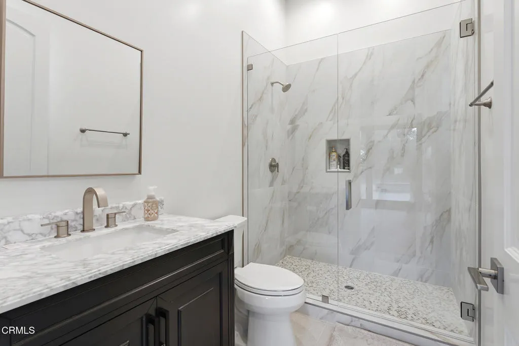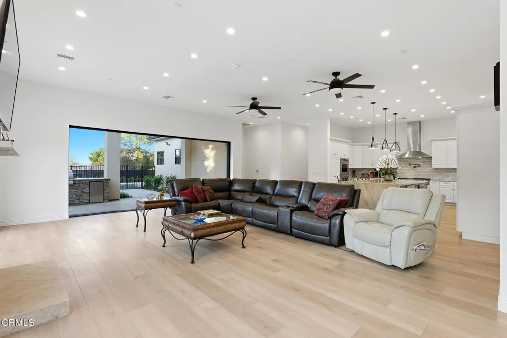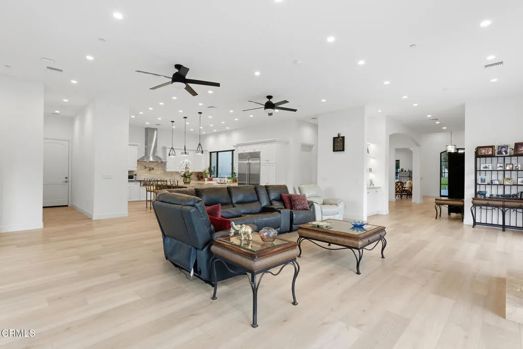 Set on a sweeping 1.33-acre corner lot in the prestigious Los Robles Estates, this one-of-a-kind custom luxury residence spans 3,725 square feet and delivers an extraordinary blend of sophistication, privacy, and resort-style living. A fully enclosed iron perimeter fence and 20-foot electric entry gate make a commanding first impression. Step inside to a grand entry with a soaring 14-foot ceiling, opening to an open-concept floor plan with 11-foot ceilings throughout the home. Wide-plank Archwood flooring flows through the main living areas. The show stopping gourmet kitchen features Sub-Zero refrigerator/freezer, Wolf range and oven, Bosch dishwasher with warming drawer, Taj Mahal quartzite countertops, French white soft-close, raised panel cabinetry, farm sink, prep sink, and reflective subway tile backsplash. A total of six bathrooms; four bathrooms are en-suite. The spa-inspired primary bath offers a Hydrospa Jacuzzi soaking tub, separate shower, Panasonic ceiling heater, and quartz countertops. In addition, an entry bath and to top it off an outdoor pool bath with stall shower for customization and privacy. Smart home features include a 3-zone programmable HVAC system with three independent AC units, two 50-amp EV charging outlets, and custom exterior lighting throughout. A fully paid 9.20kW solar system with battery backup (Sunpower, no lease) slashes utility costs. Step outside to a resort-style pool and spa with Pentair controls and color-changing LED lighting, a built-in BBQ island, firepit, and lush synthetic turf. Two separate garages allow you to park six vehicles and provide ample room for storage and more. Concrete tile roof. HOA $670/quarter. Enjoy a prime location just moments from Los Robles Greens Golf Course and an extensive network of picturesque hiking and biking trails. A statement property designed for those who demand luxury, privacy, and an unparalleled lifestyle in one of Thousand Oaks' most coveted neighborhoods.
