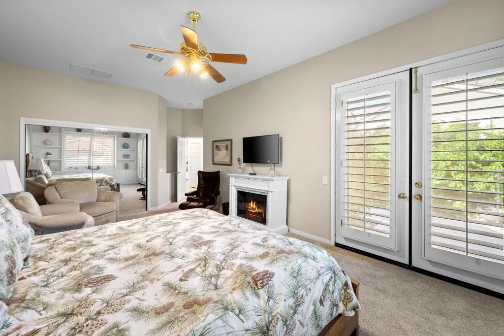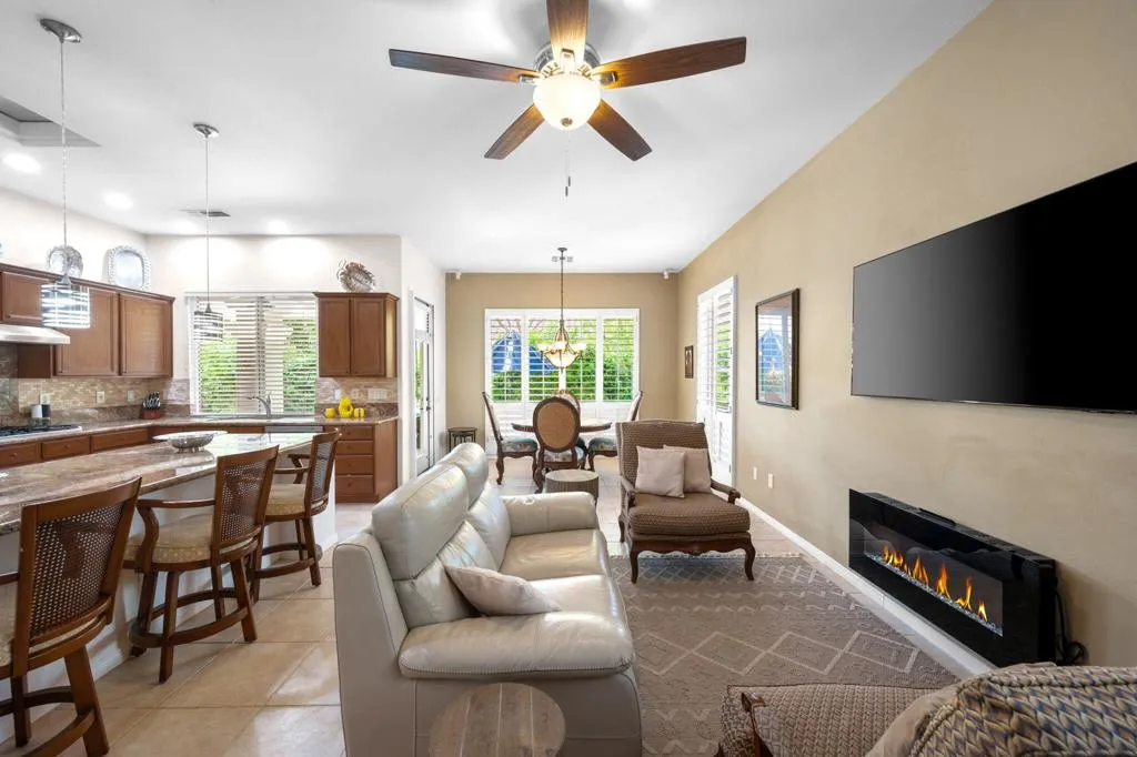 Welcome to this lovely freshly painted (exterior AND interior) Extended Monaco home with gorgeous new artistic leaded glass double doors. NEW TILE IN LIVING/DINING ROOMS (not shown), custom shutters throughout, plus new lighting in Foyer, Family Room, Living Room and Kitchen. Three bedrooms (one is currently used as a Den with elegant custom built-ins) and 3 ensuite Baths. Spacious Guest BR features a separate double door entry off courtyard, white built-in cabinets and drawers, comfy sitting area warmed by new electric fireplace, and ensuite bath. Sun filled Primary Suite flows into spacious and luxurious bath including stone topped double vanities with sit-down make up area, new sink faucets, jetted tub and walk in shower. Oversized walk-in closet offers plenty of custom storage and separate linen closet. The remodeled kitchen is a chef's joy with beautiful granite counters, new decorative backsplash and free standing island with seating and book shelves. Stainless appliances include fridge with ice/water feature, microwave/convection, large oven with warming drawer, plus new dishwasher. Desirable gas cooktop with stainless hood. Separate pantry. Kitchen is open to casual eating area and Family Room with a built in entertainment center and new electric fireplace. Laundry Room with included washer and dryer, storage cabinets, utility sink and sunny window! Enjoy privacy on your expansive pergola covered outdoor patio. Multiple seating areas, dining options and cozy firepit to gather around with friends. Enjoy fresh limes, grapefruit and blood oranges from newly planted citrus trees. Home boasts smart thermostats, newly resurfaced floor in air conditioned garage, plus new Golf Cart garage door. All lighting upgraded to LED! Amenities in this 55+community include 24 hr guard-gated security, 3 clubhouses, 2 18- hole golf courses, indoor and outdoor pools, tennis and pickleball courts, bocce ball, state-of-the-art fitness centers, restaurants, Post Office. (Some furnishings available for purchase outside of escrow.)
