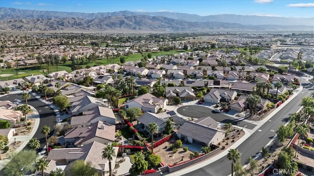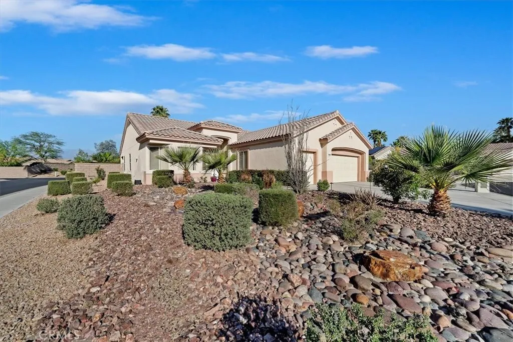 Located in the highly coveted, beautiful Del Webb community of Sun City Palm Desert this sought after Saint Croix plan sits on one of the largest and most desirable corner lots in the community. Step inside through the tiled foyer that opens to a spacious great room filled with natural light, perfectly connected to the adjacent formal dining area. The kitchen is a chef’s delight, featuring solid surface countertops, a convenient breakfast peninsula, and a center island prep station. A bright breakfast nook provides the ideal spot to enjoy your morning coffee. This versatile layout offers three bedrooms, or two bedrooms plus a den, and is uniquely enhanced by the addition of a separate bonus room with both interior access and direct entry from the garage—perfect for guests, hobbies, a studio, or private office space. The generous primary suite easily accommodates a large furniture set and includes room for a comfortable sitting area. The ensuite bath features dual sinks and a walk-in shower. Outdoor living is just as inviting with both a covered patio and an extended uncovered patio, ideal for entertaining. The backyard is beautifully framed by a flowering perimeter hedge and offers a rare opportunity to design your own outdoor oasis with space for a private pool, fire pit, game area, and more. Additional highlights include a two-car garage plus dedicated golf cart parking. Residents of Sun City Palm Desert enjoy resort-style living with incredible amenities including golf courses, lakes, waterfalls, swimming pools, clubhouses, restaurants, a library, technology center, bocce ball, tennis and sports courts, a theater, ballroom, and even a fishing lake. This is truly what desert resort retirement living is all about.