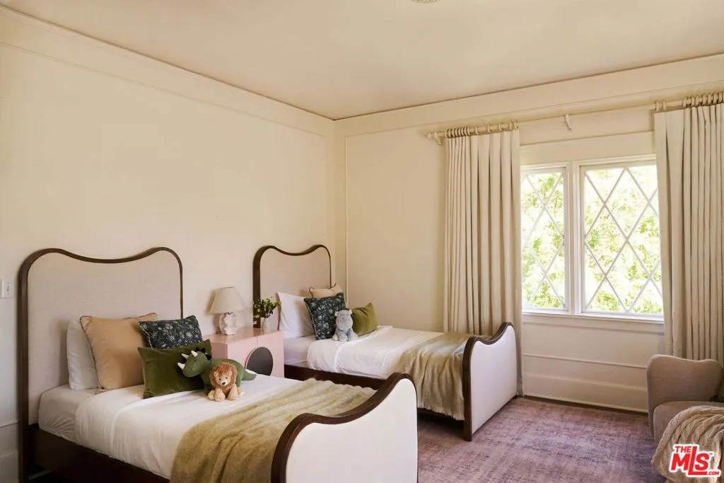 Stately and enduring, this Windsor Square English residence sits on an expansive flat lot, blending architectural pedigree with thoughtful, design-forward updates. Originally built by Meyer & Holler, known for iconic landmarks such as the Chinese and Egyptian Theatres, the home has been meticulously restored and refined by June Street Architecture, preserving its historic integrity while elevating it for modern living. A grand gated entry sets the tone, unfolding into a formal living room anchored by a fireplace, and a separate den with its own fireplace, an intimate retreat layered with warmth and character. The formal dining room connects to a well-appointed kitchen and sunlit breakfast room, with adjacent laundry and two conveniently placed powder rooms. Upstairs, a flexible and generous layout offers three secondary bedrooms alongside an extraordinary primary suite, complete with a large walk-in closet, dual baths, and a dedicated office that easily functions as an additional bedroom. The scale throughout is both impressive and livable, with beautifully preserved windows, doors, and woodwork that speak to the home's craftsmanship and history. Outside, the grounds unfold like a private park: lush, expansive, and designed for both entertaining and retreat. A pool and gazebo are set within the verdant backyard, while a detached garage offers versatile use as a gym, screening room, or creative studio. A separate guest suite provides additional flexibility for visitors or extended stays. A rare offering of scale, provenance, and enduring beauty, and just moments from the shops and restaurants of Larchmont Boulevard, this house checks every box.