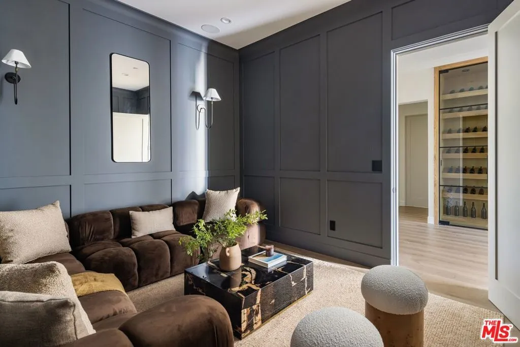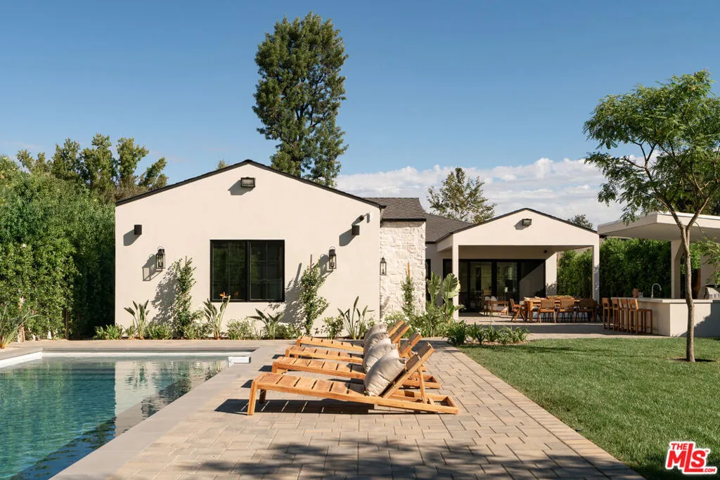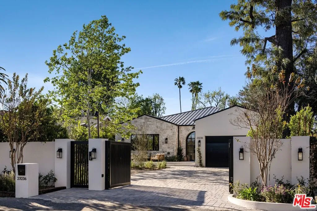 Welcome to this gated, 2025 single-story modern farmhouse compound in Walnut Acres Estates, newly finished with beautiful materials and set back from a tree-lined street with a pickleball court, an abundance of outdoor gathering space, and sparkling pool and spa. A sizable motor court is set amidst carefully placed drought-tolerant landscaping and cozy sitting areas under shade trees. Through a beautiful curved glass-paned front door, visitors discover high ceilings, warm woods, and organic hues throughout. The living room is centered by a stone fireplace flanked by thoughtfully designed built-in book cases that continue the home's casual, artistic vibe. The kitchen is grand and elegant, with custom cabinetry, state-of-the-art appliances including a commercial-grade range with smartly designed hood plus pot filler, and oversized center island. The adjacent butler's pantry perfectly connects to the formal dining room for catering and entertaining. Nearby is a glass-encased wine cellar and a plush theatre/screening room. In the owner's wing, sliding glass opens to gardens and patios for effortless indoor-outdoor living. The primary bath is large, with a dual-sink vanity, soaking tub, and rainwater shower adjacent to the walk-in wardrobe with custom built-ins. Secondary bedrooms are also en-suite, and one is currently utilized as an office. Privacy hedges surround the backyard, with its variety of spaces to relax, recline, and converse, including a covered outdoor living room, al-fresco dining area, and barbecue with prep sink and bar ledge. Enjoy the shimmering waters of the pool and spa, roam and play on the grassy lawn, or challenge friends to a game of pickleball or basketball on the sport court. Effectively new construction and never before lived in. Welcome to an ideal location close to parks, schools, houses of worship, and the 101 Freeway, just moments to the Calabasas Commons, Westfield Topanga and Village, and upcoming Rams Village at Warner Center. Top-rated Woodlake Avenue Elementary School.