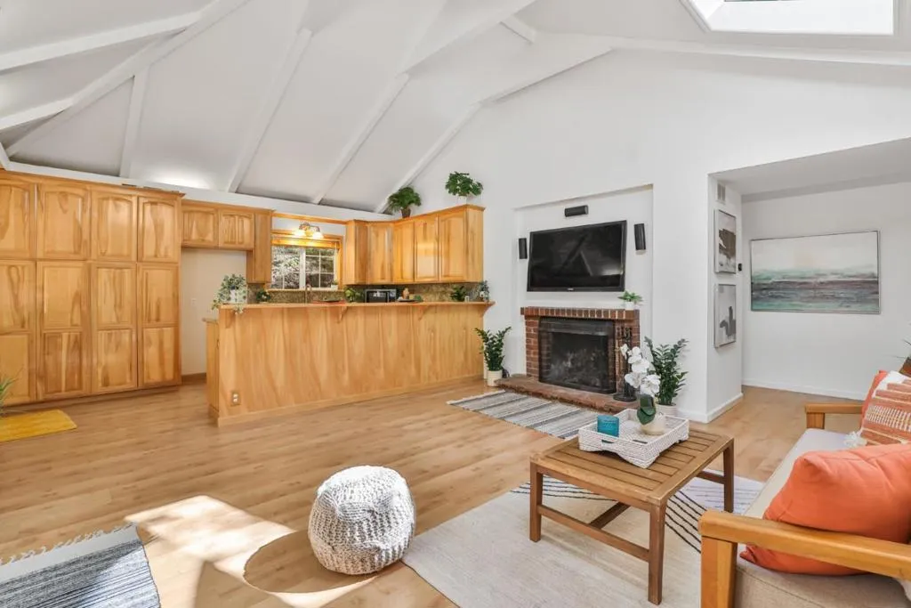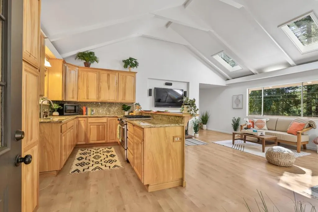Welcome to this serene and majestic retreat, where comfort meets natural beauty. This open and airy home features soaring high ceilings and abundant skylights, filling the space with natural light and creating a warm, inviting atmosphere. Fully remodeled, the home showcases beautiful wood laminate flooring throughout, offering both style and durability. It includes two generously sized bedrooms and a full bathroom complete with a shower over tub. The newly updated kitchen is a standout, featuring ample cabinetry and eye-catching counter tops perfect for both everyday living and entertaining. Expansive windows throughout the home frame picturesque views of towering redwood trees and bright blue skies, bringing the outdoors in. Step outside onto the spacious deck, ideal for entertaining guests, enjoying your morning coffee, or unwinding with a good book in peaceful surroundings. Additional highlights include a driveway that comfortably accommodates two vehicles and newer stairs providing easy access to the property. Tucked away for ultimate privacy, this home is a perfect getaway or an ideal haven for a small family. Lastly, its a easy commute to the beach or Silicon Valley.
