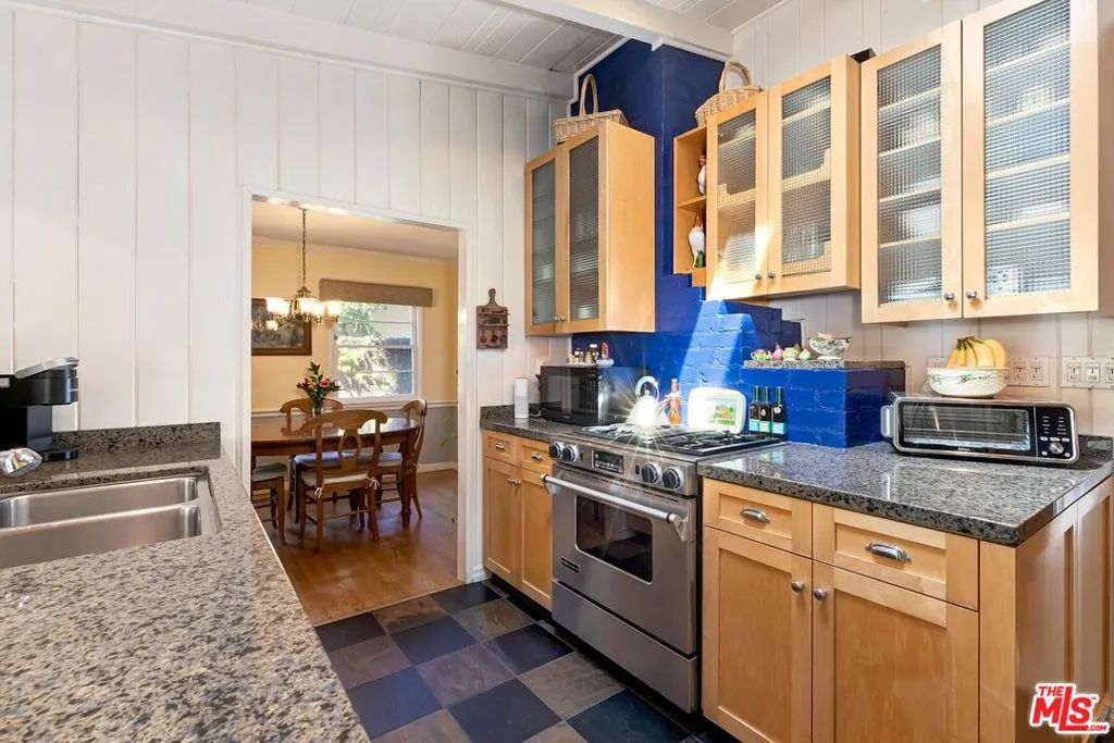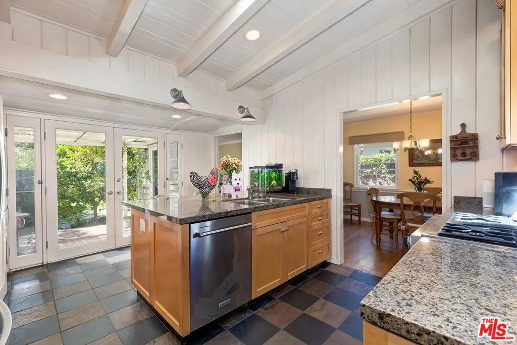 Charming Mid-Century Home in Coveted Westside Village. Welcome to this warm and inviting home nestled in the heart of Westside Village. A covered front porch overlooks the grassy yard, mature trees, and vibrant birdlife, where finches and hummingbirds create a peaceful, nature-filled setting. Inside, a spacious living room showcases rich hardwood floors, a classic brick fireplace, and a stunning vaulted wood-beamed ceiling. The bright, airy kitchen mirrors this architectural charm with its own vaulted ceiling and skylight, and features stainless steel appliances, a peninsula with counter seating, and glass doors that open seamlessly to the covered back patio, perfect for indoor-outdoor living. A formal dining room offers flexibility as a potential fourth bedroom, office, or creative space. With three bedrooms, including the primary suite with hardwood floors and a private en-suite bath, back bedroom, and separate corner bedroom that enjoys direct access to the backyard through its own glass door. Step outside to a beautifully landscaped backyard retreat featuring a flagstone patio, grassy lawn, intimate deck area, and lush greenery, including bougainvillea, hedges, and mature citrus trees: lemon, tangerine, and orange. The detached garage presents endless possibilities as a gym, art studio, or future ADU conversion. Ideally located just minutes from Trader Joe's and the shops, restaurants, and parks of downtown Culver City, this home also offers access to highly regarded Clover Avenue Elementary, celebrated for its strong academics and close-knit community. Amazing Westside Location!