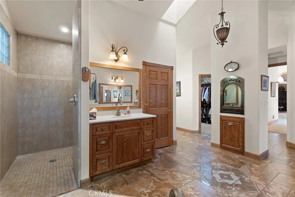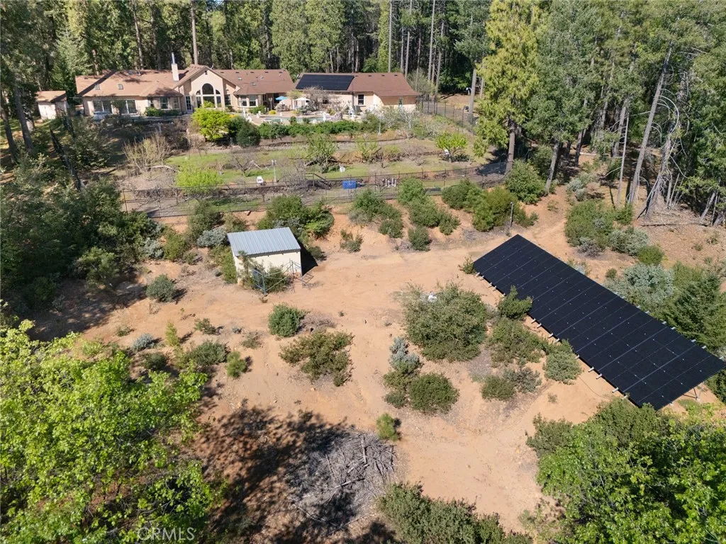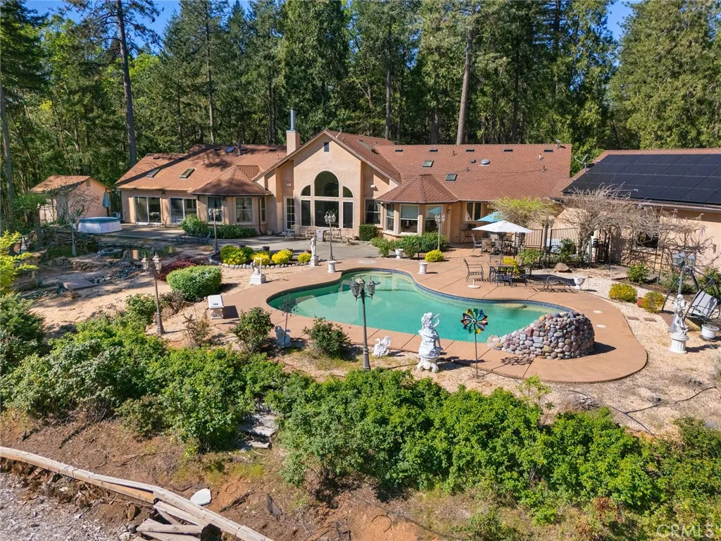 Nestled among the towering pines of Forest Ranch, this extraordinary estate showcases breathtaking views and an unmatched sense of serenity. Set on 23 private acres, the property boasts a sparkling in-ground pool, owned solar, & an expansive four-car garage—just the beginning of what this remarkable retreat offers. Step inside to soaring 23-foot cathedral ceilings & an abundance of windows that perfectly frame the picturesque surroundings. The great room is both inviting and impressive, featuring skylights, a stunning stone fireplace, & ample space for entertaining or cozy evenings at home. Just off the main living area, a versatile den offers endless possibilities—whether a home office, game room, or additional lounge space. Elevate your culinary experience in the thoughtfully designed gourmet kitchen, complete with Brazilian cherry hardwood floors, Corian countertops, cherry wood cabinetry, white tile backsplash, a gas range, a center island with a vegetable sink, & an expansive walk-in pantry with shelving and freezer space. The sunlit breakfast nook provides the perfect setting to enjoy your morning coffee while taking in the tranquil views. The luxurious primary suite is a private sanctuary designed for comfort & relaxation, featuring elegant tile flooring, custom oak built-ins, & a spa-inspired en suite bath with dual vanities, a soaking tub, walk-in shower, spacious closet, linen storage, grooming area, & bidet-equipped toilet. What truly sets this home apart is the indoor endless pool for year-round swimming and fitness. Additional highlights include three guest bedrooms, ceiling fans throughout, recessed lighting, dual HVAC systems, & an indoor laundry room with oak cabinetry and a utility sink. Outdoors, enjoy a beautifully designed in-ground pool, expansive patio, fully fenced backyard, hot tub, firewood storage building, & two serene koi ponds with a cascading waterfall. Fruit trees dot the landscape, and with 23 acres, there is endless opportunity to expand and make it your own. The property is accessed via a gated entrance shared with neighboring homes, adding privacy and security. Offering a rare blend of comfort and beauty, this exceptional property is truly one you don’t want to miss.