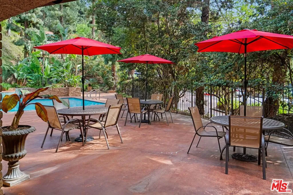 Your permanent vacation starts at Cahuenga Hills Tennis Condominiums! Unit 1203 is a bright, front-facing residence conveniently tucked at the front of the complex, elevated above the parking area with easy access. The updated space feels warm and inviting, featuring light flooring that ties the home together and a curated wall color palette that adds a modern, refreshed feel. The updated kitchen offers ample cabinetry, durable quartz countertops, and stainless steel appliances that open seamlessly into the living area and out to a private balcony surrounded by greenery, creating an incredible indoor-outdoor flow. Additional features include recessed lighting throughout, double-pane windows that bring in abundant sunlight, Nest-controlled central air, and in-unit laundry. This resort-style gated community offers a full suite of amenities including two pools (with a heated main pool), tennis courts, two fitness centers, dry sauna, dog park, a private hiking trail behind the property, ample guest parking, and a recreation room with library, kitchen, pool table, and ping pong, along with a security guard, upgraded camera system, and Butterfly access. What is more, your cable, internet, water and trash are included! Ideally located near the Hollywood Bowl, major studios, famous hiking trails, the beautiful Hollywood Reservoir, and the 101 freeway, this is comfortable, low-maintenance living with a true retreat-like feel in the heart of the city. Your permanent vacation awaits! ***Property also listed for lease at $2,995 per month.***