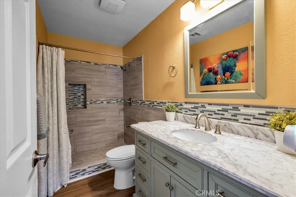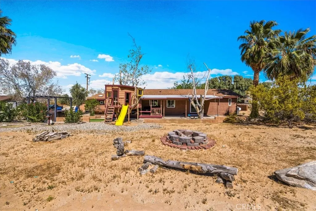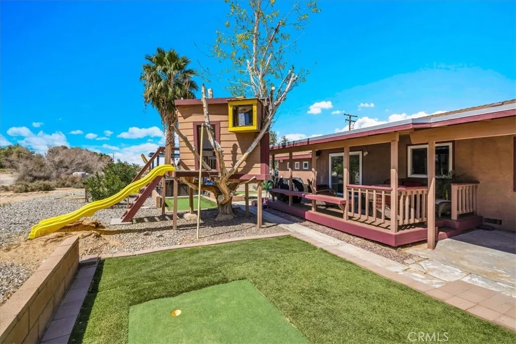 Don’t miss this rare opportunity to own a stunning 4-bedroom, 2-bath golf course home in one of 29 Palms’ most sought-after neighborhoods! One of only 19 homes on the course, this property sits right on the 7th fairway, offering beautiful views and a peaceful setting. Recently remodeled, this home shines with modern upgrades including new flooring and a stylish kitchen with quartz countertops, tile backsplash, stainless steel appliances, and a breakfast bar. The open dining area leads directly to the backyard, perfect for indoor-outdoor living. The spacious primary suite features backyard access and a beautifully updated en-suite bath with dual sinks, soaking tub, and separate shower. A bright step-down den with skylights and its own split system adds flexible living space. Recent upgrades include a newer roof (under 3 years old), fresh exterior paint, new well pump, and upgraded irrigation system. The landscaped yard is enhanced by mature pomegranate and olive trees, plus a private well for efficient watering.Relax or entertain in the backyard oasis complete with a composite deck, outdoor sink, BBQ area, and hot tub with sun deck. Additional highlights include RV & boat parking, a storage shed, laundry room, and even a treehouse! All just minutes from the Marine Corps base, Joshua Tree National Park, downtown, shopping, and dining.