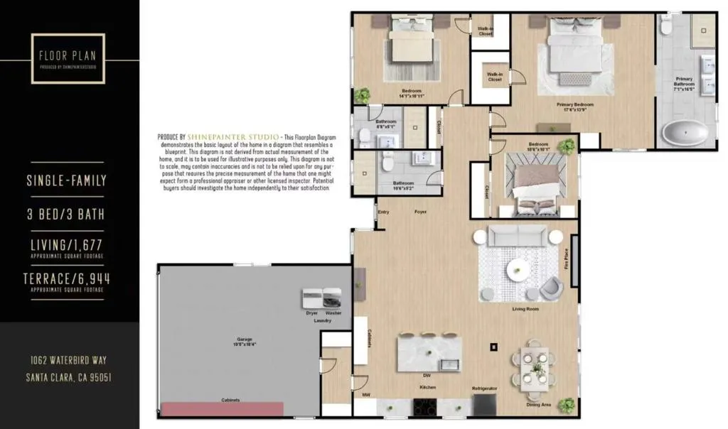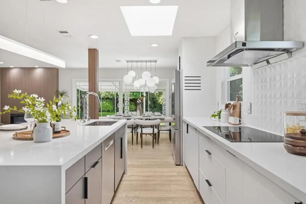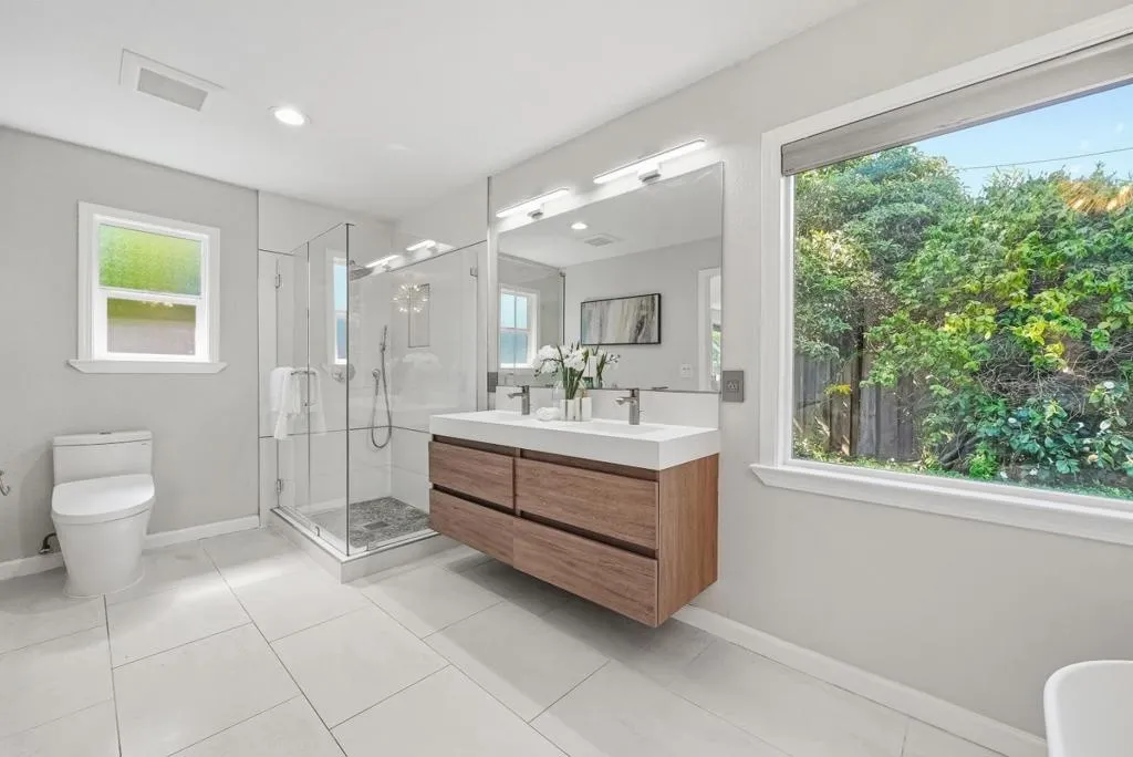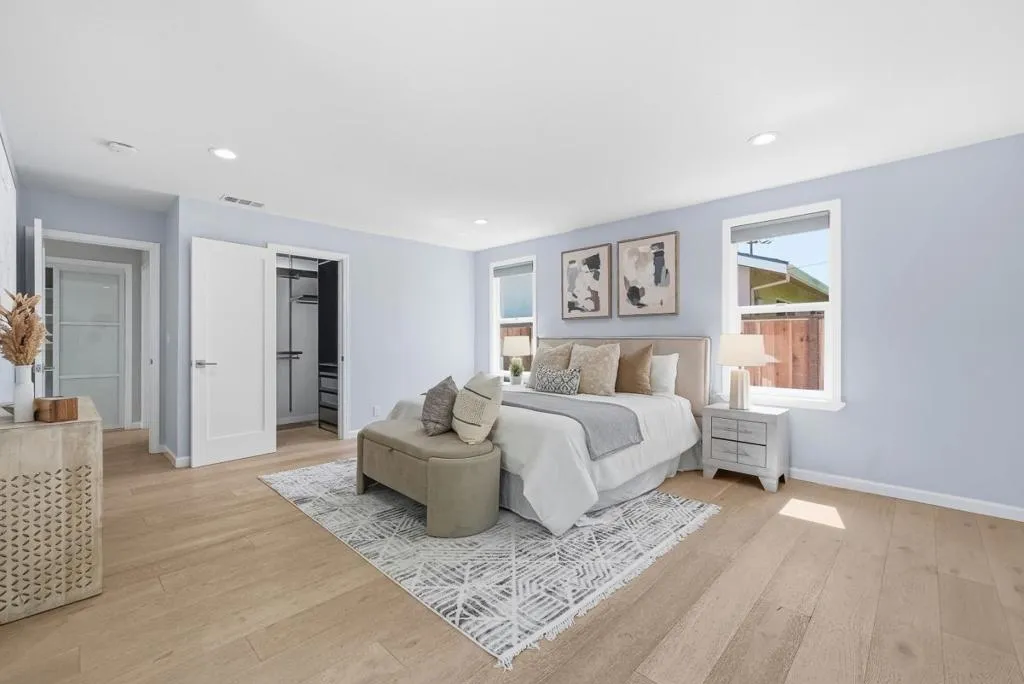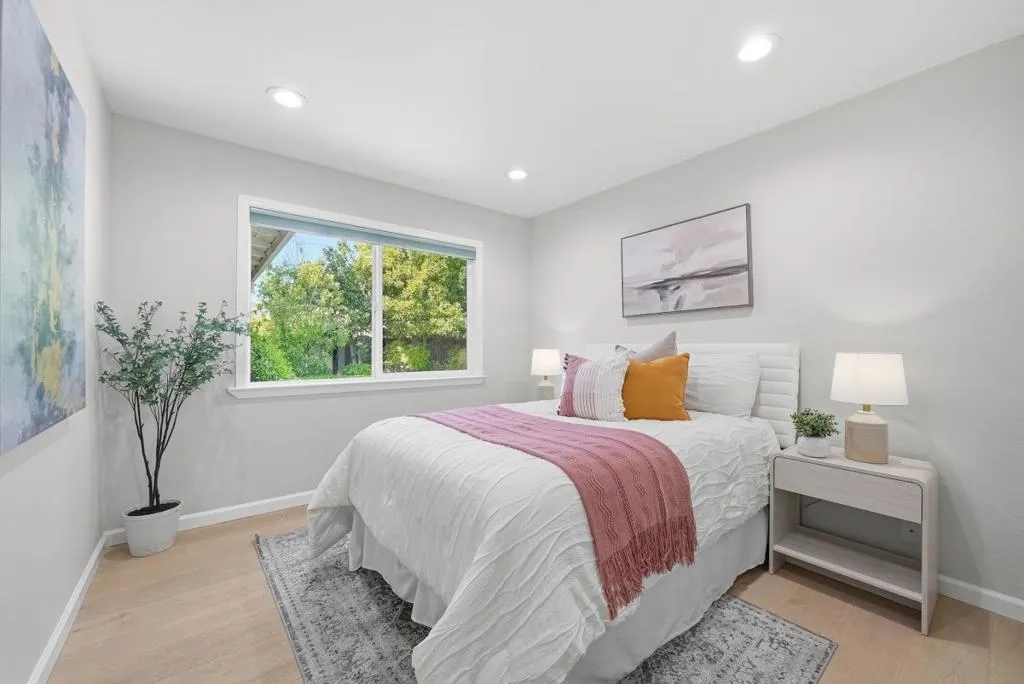 Welcome to this gorgeous east-facing 3-bed, 3-bath (two suites) single-family home in Santa Clara, set on a 6,944 sqft lot. The home welcomes you with a beautiful front yard and porch. Inside, an open floor plan with modern finishes features a large living room with a stylish fireplace and recessed lighting. The gourmet kitchen offers a large island with quartz countertop, sink, and breakfast bar, accented by a modern bar light above, plus stainless steel appliances, ample cabinetry, and a skylight. The dining area connects seamlessly and features a beautiful pendant light. A large sliding door leads to the backyard, creating ideal indoor-outdoor living. The spacious primary suite includes a walk-in closet, bright windows, and a sliding door to the backyard. Its en-suite bath features a double-vanity sink, floating cabinetry, stall shower, and soaking tub with a beautiful ceiling light and large view window. Another suite at the front offers an updated stall shower. Down the hallway is an additional bedroom and a hallway bathroom with stall shower. All bathrooms include smart toilets. Enjoy nearby restaurants, grocery, and shopping. Just 5 minutes to Apple Park with easy access to Lawrence Expy and Hwy 280 for a short commute to major tech companies. Do not miss this great one!
