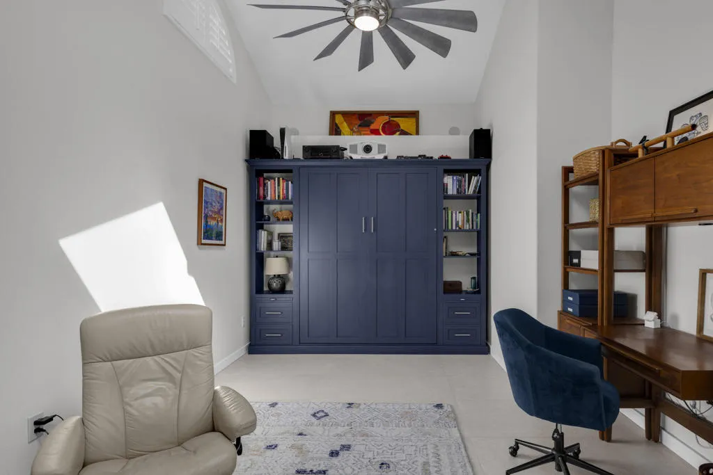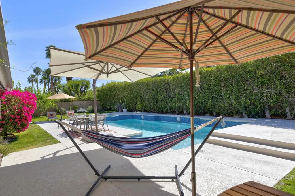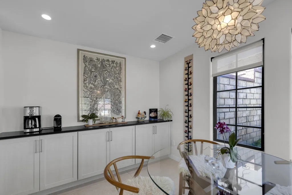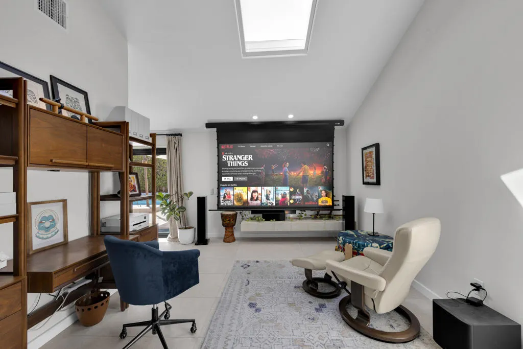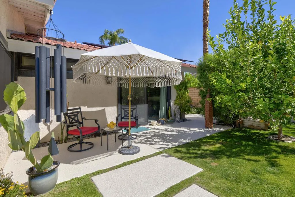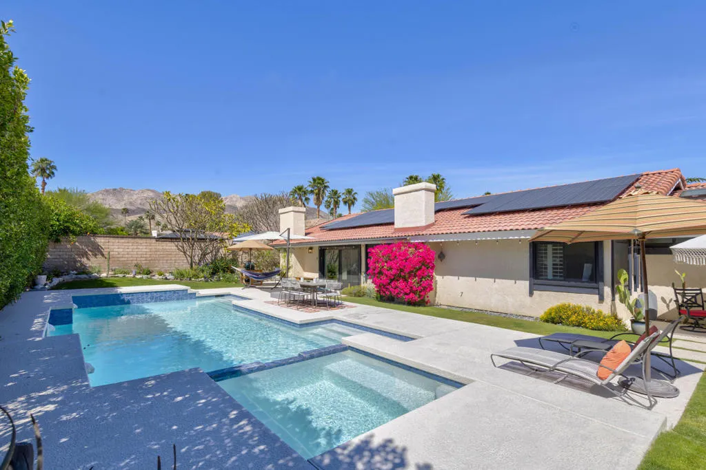 Situated within the coveted Canyon Cove enclave of Palm Desert, just moments from the boutiques and dining of El Paseo and the renowned Living Desert, this extensively reimagined residence offers refined living with thoughtful upgrades throughout. The home features 2 bedrooms, 2.5 baths, plus a versatile flex space, all complemented by high-end finishes and 30 owned solar panels.Set on an expansive south-facing lot exceeding 12,000 square feet, the outdoor setting captures striking mountain views and has been enhanced with newly installed landscaping, irrigation, ambient lighting, and a dedicated vegetable garden. The refreshed pool and spa include updated equipment, while multiple seating and dining areas create an inviting setting for outdoor entertaining. The front landscape has been carefully designed to qualify as a Certified Wildlife Habitat through the National Wildlife Federation.Inside, the residence has been meticulously updated with new tile flooring, baseboards, and a fully remodeled kitchen featuring custom cabinetry, premium appliances, and Cambria quartz countertops. A thoughtfully added wall creates a charming breakfast nook with a quartz-topped butler's counter, while the spacious flex area functions seamlessly as an office, guest accommodation with a Murphy bed, and home theatre room equipped with upgraded wiring, sound system, projector and projection screen.Additional improvements include a redesigned wet bar, a second bedroom with raised ceilings and en-suite bath finished with new cabinetry and designer tile, and a fully upgraded three-car garage featuring new doors and equipment, an EV charger, air conditioning, and finished ceiling. Further enhancements include new windows and sliding doors, a new HVAC system with updated ductwork, upgraded electrical switches and outlets, new toilets, fresh interior paint and pool deck, and a tankless water heater.Residents of Canyon Cove enjoy access to community amenities including a pool, tennis and pickleball courts, sauna, locker rooms, and showers, with cable and internet services included.