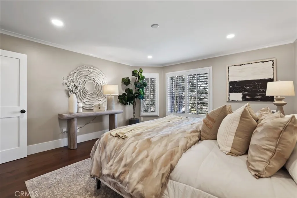 Featuring one of the most thoughtfully upgraded and updated interiors in this charming French Provincial-style community, this home evokes the feeling of living in a picturesque countryside village in the South of France—where timeless architecture, peaceful surroundings, and refined design create an atmosphere of effortless elegance. Situated in the gated enclave of Villa de Cerise in Laguna Niguel, vaulted ceilings and new engineered hardwood floors welcome you, while white plantation shutters and recessed lighting enhance the light-filled, open ambiance. The living room, centered around a fireplace with a white brick surround and elegant wood accent wall, flows seamlessly through French doors to a private backyard retreat featuring upgraded tile, a new iron fence, and a rare no-rear-neighbor setting—perfect for quiet mornings or intimate gatherings under the coastal sky. The gourmet kitchen is a true showpiece, offering quartz countertops, a spacious island with bar seating, farmhouse sink, stainless steel appliances, designer lighting, and upgraded hardware—all open to the living area for effortless entertaining. The primary suite offers a large walk-in closet with custom built-ins, while the beautifully upgraded en suite features a dual-sink quartz vanity, patterned tile flooring, and a remodeled walk-in shower with bench and subway tile backsplash. Additional bedrooms feature engineered hardwood floors, plantation shutters, and generous closet space, complemented by a full bathroom with dual sinks and a shower/tub combination. A stylish powder room with a designer console vanity and open shelving adds both charm and functionality. Thoughtful upgrades continue throughout, including an epoxy-finished garage with added cabinetry and new motor, along with a new A/C and water heater. Located just minutes from Dana Point Harbor and world-class beaches, this home offers a rare blend of French-inspired charm and coastal California living—an exceptional opportunity to experience elevated style, comfort, and sophistication.