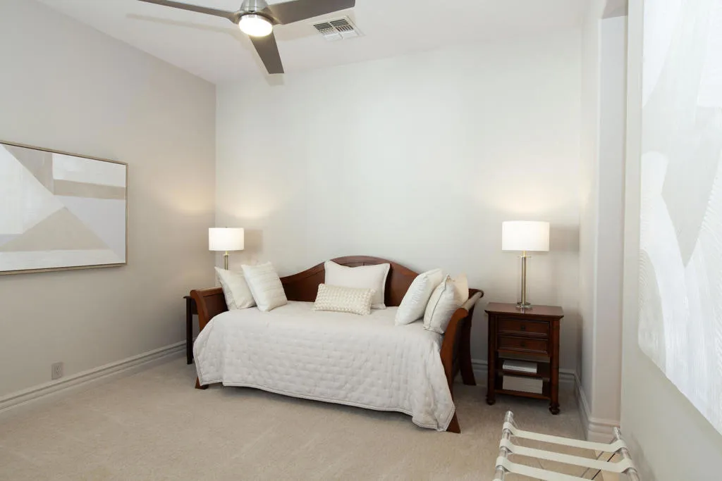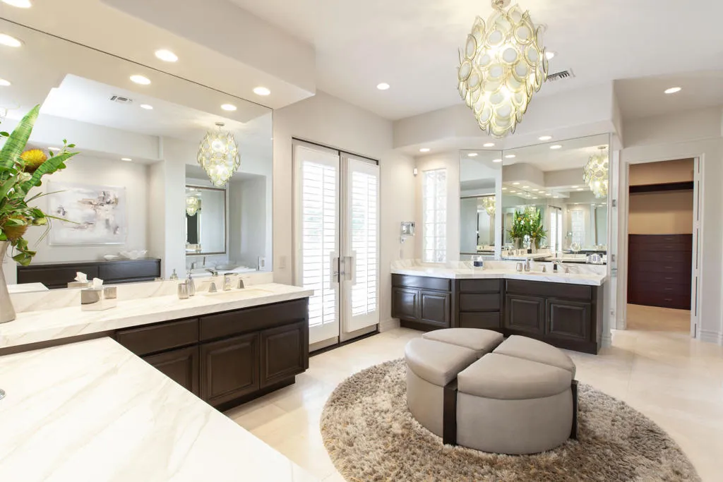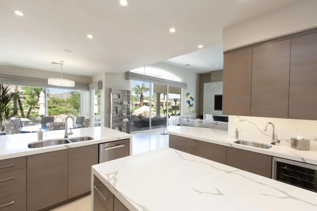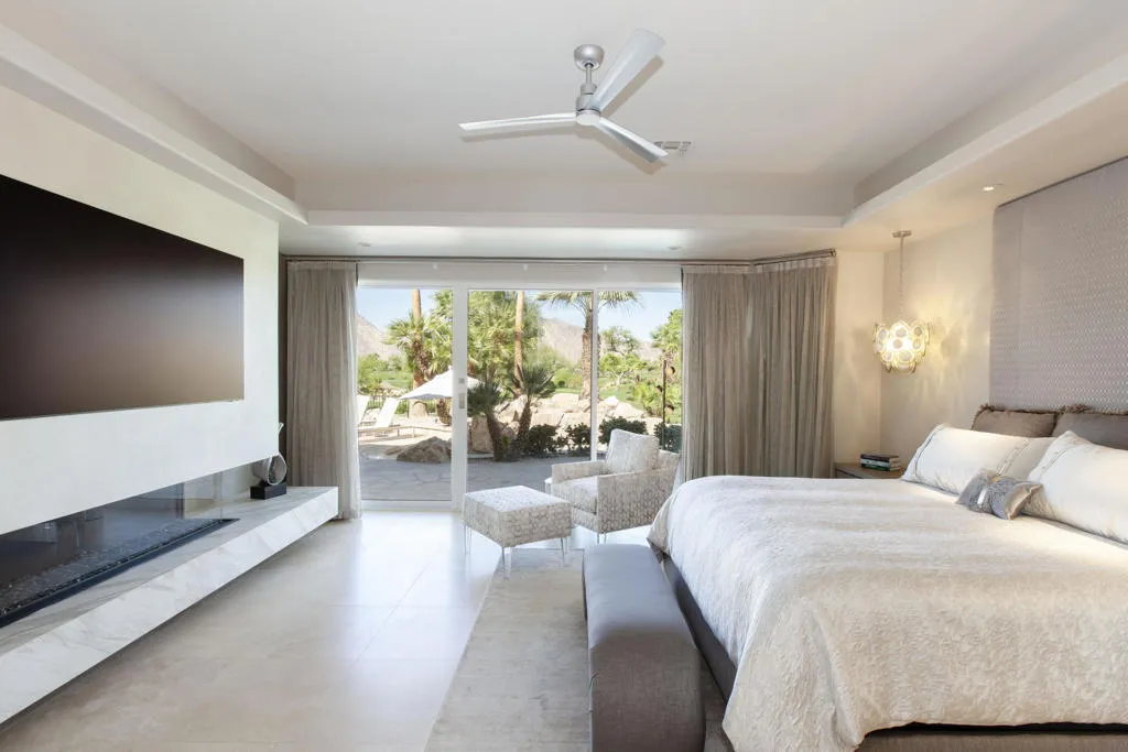 Set within the prestigious gates of Rancho La Quinta Country Club, this one-of-a-kind reimagined Montana I residence evokes the elevated design and refined aesthetic of a custom home, offering a rare blend of architectural sophistication, modern luxury, and breathtaking natural beauty. Positioned on an expansive 15,246 sq. ft. cul-de-sac lot, the home is elevated to capture sweeping views of the Santa Rosa Mountains, rugged foothills, and multiple fairways--creating a dramatic and ever-changing desert backdrop. A striking arrival begins with contemporary dual wood and frosted glass entry doors, opening to a custom half-moon marble-topped foyer accented by an art niche, designer lighting, custom paint, and curated wall coverings. Inside, the home has been completely redesigned to deliver a modern, gallery-like living experience. Expansive great room living is anchored by a cantilevered floating 8-foot fireplace beneath a sleek suspended TV wall, all set atop 24'' x 24'' travertine stone flooring that flows seamlessly throughout. The reimagined floor plan includes a reshaped dining area and a sophisticated open-concept layout ideal for both intimate living and grand entertaining. The designer kitchen is a true showpiece, featuring quartz countertops, a large center island, and premium stainless appliances including a Sub-Zero refrigerator, Wolf microwave and double ovens, Bosch dishwasher, and wine refrigeration.The primary suite is a luxurious retreat, thoughtfully redesigned with a floating 5-foot fireplace and modern TV wall, while the spa-inspired bath offers a step-in, step-out shower, soaking tub, and French doors opening directly to the resort-style backyard. One guest bedroom has been transformed into a contemporary office, while two guest casitas provide exceptional privacy and flexibility for visitors. Outdoor living reaches new heights with a spectacular resort pool environment featuring a large swimmer's pool, separate party pool, dual waterfalls, spa, and an elevated viewing deck--all designed to maximize the stunning panoramic setting. A spacious BBQ island anchors the entertainer's patio, while the fenced backyard adds both definition and functionality. Additional enhancements include custom window coverings with electronically controlled shades, newly painted exterior, and professionally redesigned landscaping. Three-car garage features air conditioning, epoxy flooring and built-in storage. See Improvements List. Furnished per Inventory.