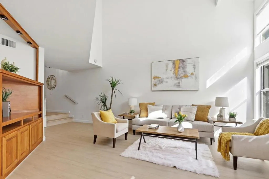 Move in and enjoy this beautiful 3-bed, 2.5-bath home in the desirable Capistrano Community, offering a great commute location and access to highly rated Cupertino schools. Nestled in a peaceful, park-like setting with monitored entry, this bright end-unit features a private backyard designed for CA living, complete with an outdoor kitchen ready for entertaining. Inside, you'll find soaring vaulted ceilings in the living room, a bright dining area overlooking the backyard, and fresh interior paint throughout. The first floor features new flooring, while the second floor offers brand-new carpet. The open kitchen includes quartz countertops, a breakfast bar, and stainless-steel appliances, ideal for everyday living and hosting guests. Inside laundry adds convenience. Upstairs, the primary suite features a vaulted ceiling and an updated ensuite bathroom. Two additional spacious bedrooms share a private balcony, offering a charming outdoor extension. The attached two-car garage provides excellent space for parking and extra storage. The community offers low HOA dues and is assigned to highly rated schools. Prime location near Apple Park, with easy access to major freeways and expressways and just minutes from the shops and restaurants of Santana Row.