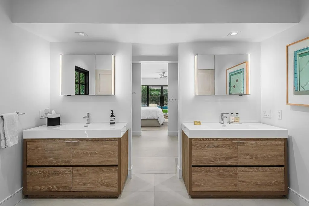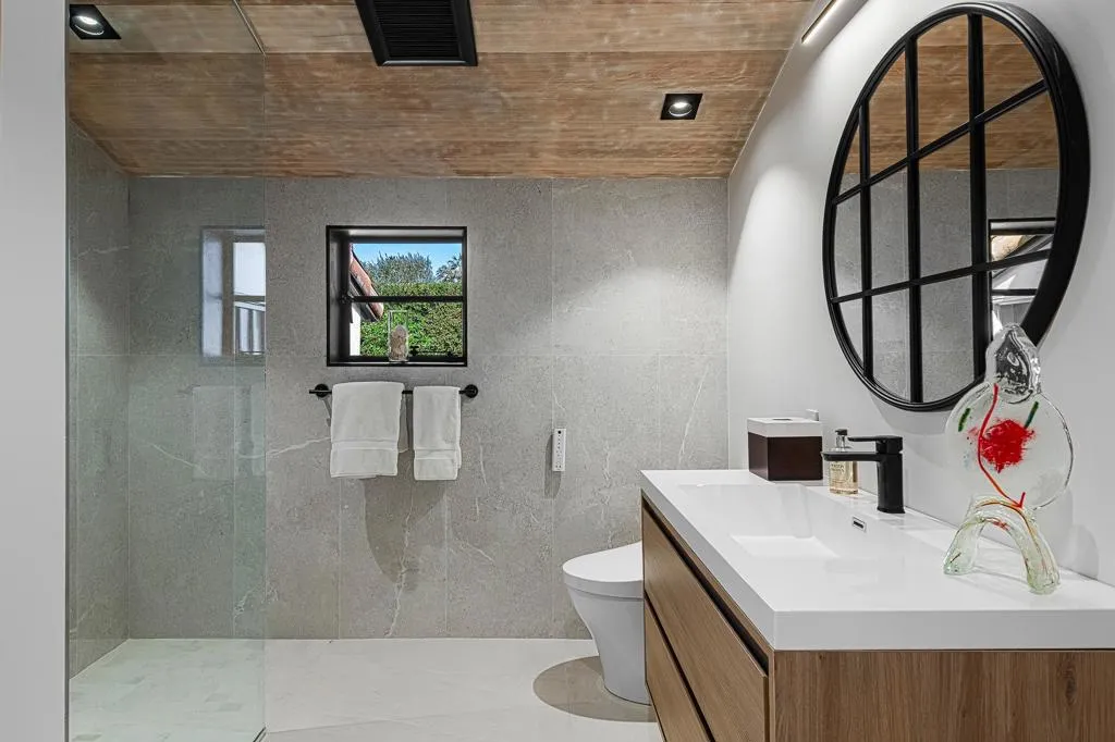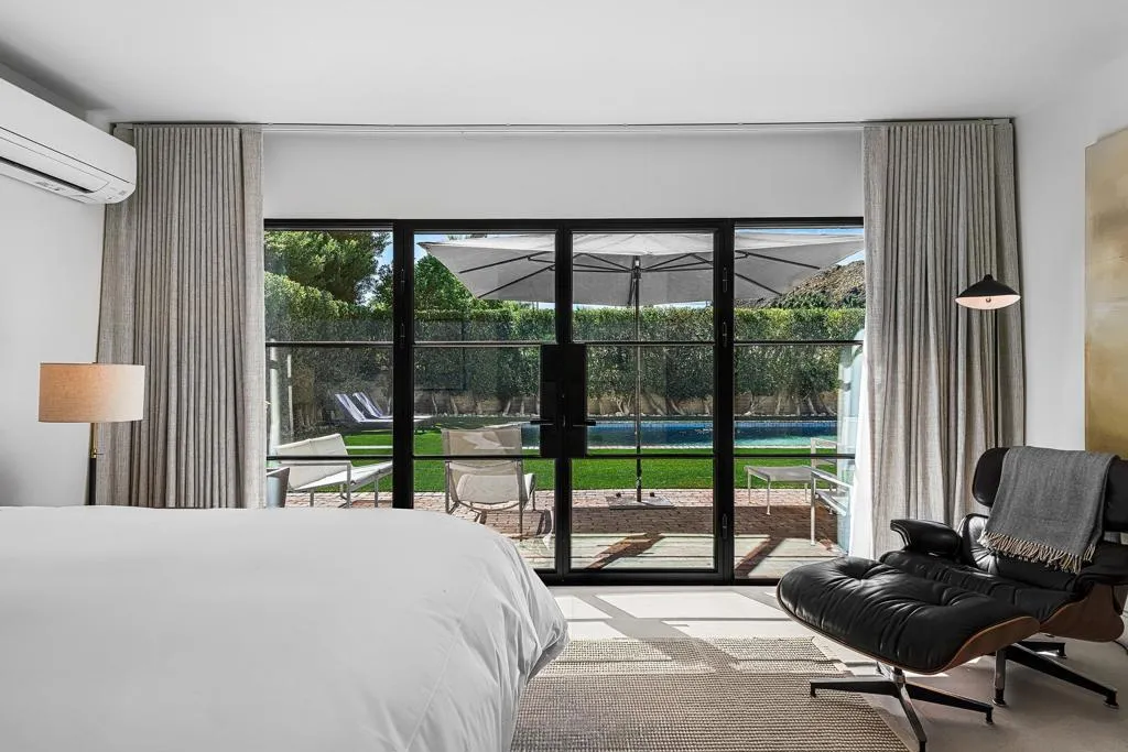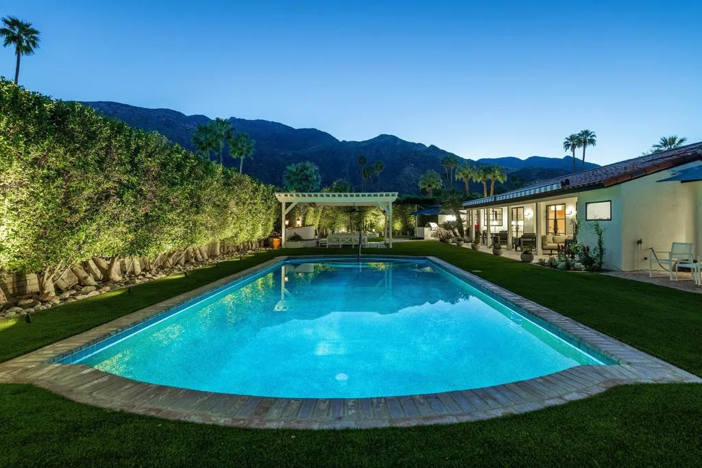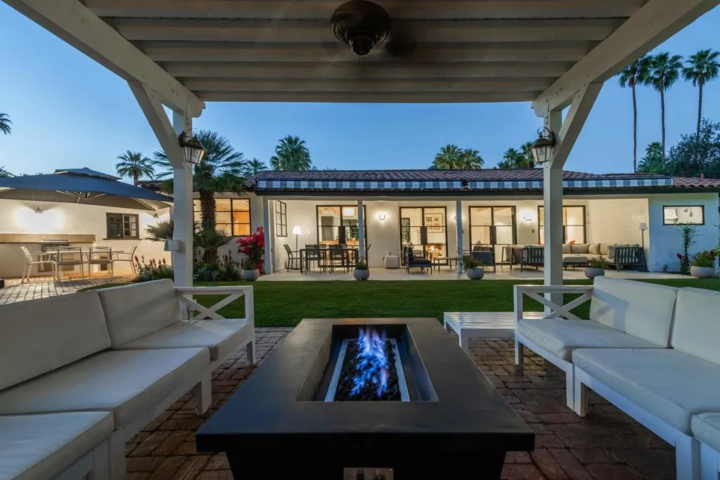 Welcome to this enchanting, fully reimagined residence tucked behind walls and lush hedges in prestigious Old Las Palmas. Originally built in 1946, this classic ranch was taken to the studs and transformed into a striking modern contemporary, thoughtfully designed for seamless indoor-outdoor living and effortless entertaining, completed in 2025.Enter through the pedestrian gate into a private, garden, where newly curated landscaping, vibrant florals, and premium artificial turf create a true sense of arrival. Inside, the transformation unfolds into a stunning great room with an open-concept design, flooded with natural light and anchored by a statement fireplace that brings warmth and ambiance to the space.The home offers three well-appointed bedroom suites, plus a versatile fourth bedroom currently used as an office/media room. A third bath functions as a powder room while also providing a shower connection to the fourth bedroom.At the heart of the home, the chef's kitchen is a masterpiece of both form and function, sleek, seamless, and thoughtfully concealed. Custom flush cabinetry and shuttered elements reveal hidden features including a dry bar, ice maker, and integrated storage for dishware, glassware, and small appliances. An eating bar, breakfast nook, and dining area all overlook the resort-style backyard, creating a natural flow for everyday living and entertaining.Multiple doors open to create a true indoor-outdoor experience, extending the living space into a beautifully designed outdoor retreat. Enjoy the expansive entertaining area complete with an outdoor kitchen, fire pit lounge, and an automatic shade structure that stretches across the yard for added comfort.The west-side bedroom suite offers privacy for guests or flexible use, while the primary suite, positioned on the east end of the home, is a tranquil retreat accessed through double doors. Designed for comfort and relaxation, it features its own A/C, automatic shades and drapes, and ceiling fan. The spa-inspired primary bath includes a walk-in shower, Toto toilet, dual vanities, and a convenient stacked laundry.An additional guest suite overlooks the pool and garden, with the office/media room just across the hall, offering flexibility for modern living.Additional highlights include a two-car garage with epoxy floors and enhanced ceiling insulation, plus additional side parking. The property sits in a prime interior location with southern exposure and beautiful mountain views.