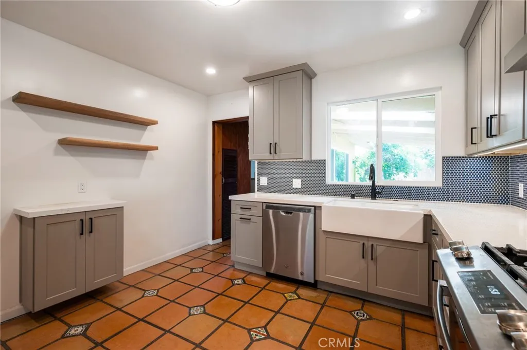 Modern Upgrades Meets Southwestern Charm Experience the perfect blend of modern luxury and timeless character in this 3BR/2BA, 1,590 sqft single-story home. The heart of the home is a stunning chef’s kitchen, fully renovated with grey shaker cabinetry, white quartz countertops, a farmhouse sink, and premium stainless steel appliances. The expansive great room impresses with vaulted wood-beam ceilings, classic Saltillo tile, and a cozy brick fireplace. Retreat to a primary bath featuring a vibrant, hand-painted Talavera sink for a touch of artisanal flair. The private, block-walled backyard is an entertainer's dream, featuring a large covered patio, lush lawn, and mature fruit trees. With a spacious driveway, stylish carriage-style garage doors, and vibrant curb appeal, this move-in-ready gem offers unique personality and single-level convenience. Priced at $355/sqft—don't miss out!