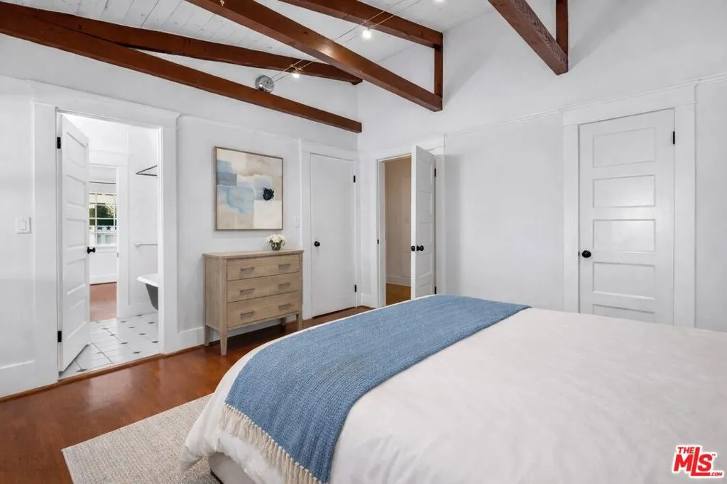 This three-bedroom Craftsman bungalow encompasses approximately 2,000 square feet of living space and has been thoughtfully updated over time, blending classic architectural charm with everyday functionality. A private, grassy front yard framed by mature citrus trees creates a welcoming approach and a sense of seclusion rarely found in Venice. Inside, the spacious living room sets the tone with a decorative fireplace, built-in bookshelves, and exposed wood beams that highlight the home's timeless Craftsman style. Adjacent to the living room, a generous dining area features a built-in buffet, ideal for entertaining and everyday living. Two well-proportioned bedrooms are located off the living room and share a charming bathroom with a classic clawfoot tub. Beyond the dining area, the kitchen offers both character and practicality, anchored by a classic Wolf range and complemented by a large walk-in pantry an uncommon and highly desirable feature for a home of this era. There is a brand new washer and dryer, as well as a new dishwasher. The primary suite is privately positioned at the rear of the home and is notably spacious, allowing flexibility for a secondary living area, creative space, or a full home office setup. The suite includes a large walk-in closet, built-in shelving, and an updated en-suite bathroom with a walk-in shower. A front porch provides the perfect spot to relax and enjoy the privacy of the landscaped yard. Plentiful street parking is available right in front of the fenced yard. Ideally located within walking distance to top restaurants and everything Abbot Kinney has to offer, and just a short bike ride to the beach, this home delivers the Venice Beach lifestyle in a peaceful residential setting close to vibrant activity.