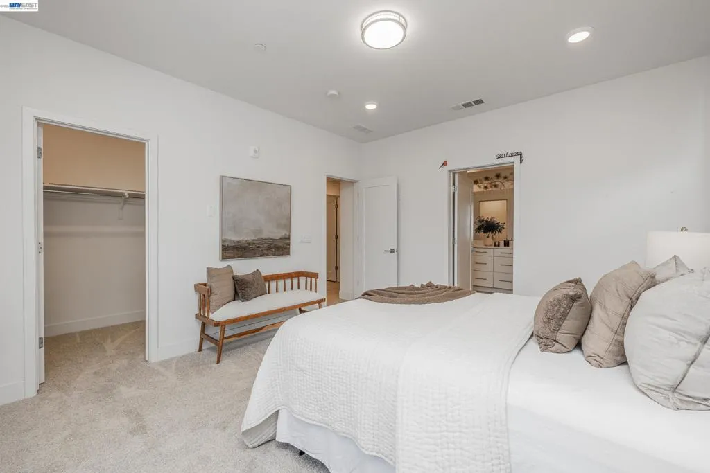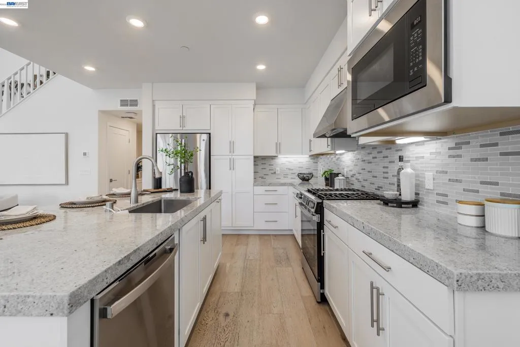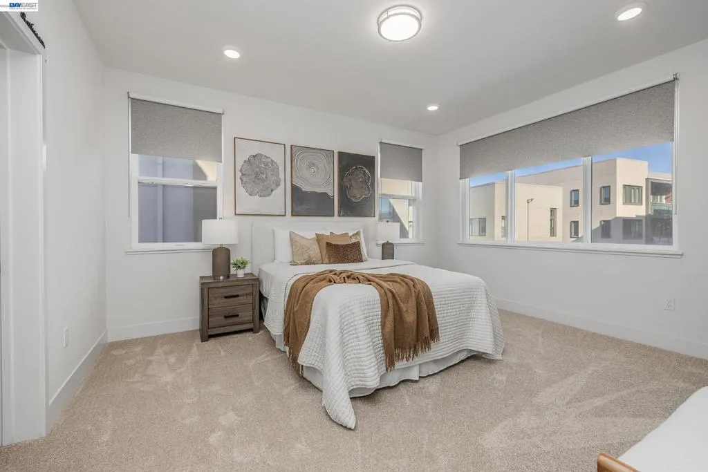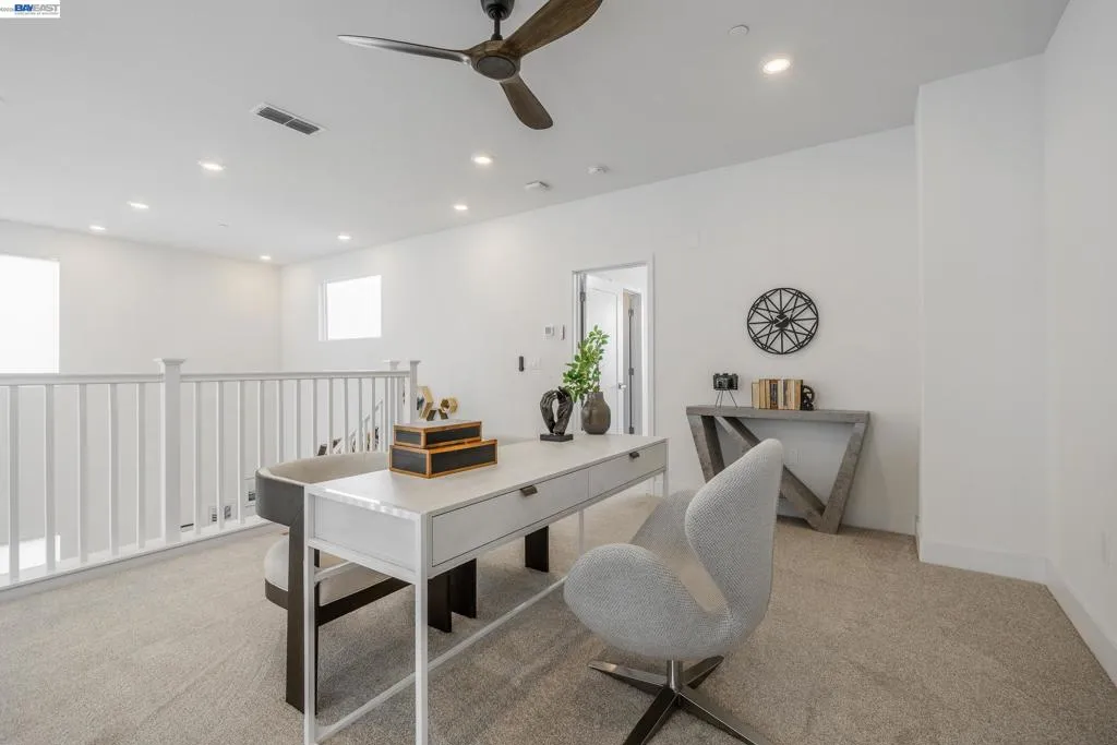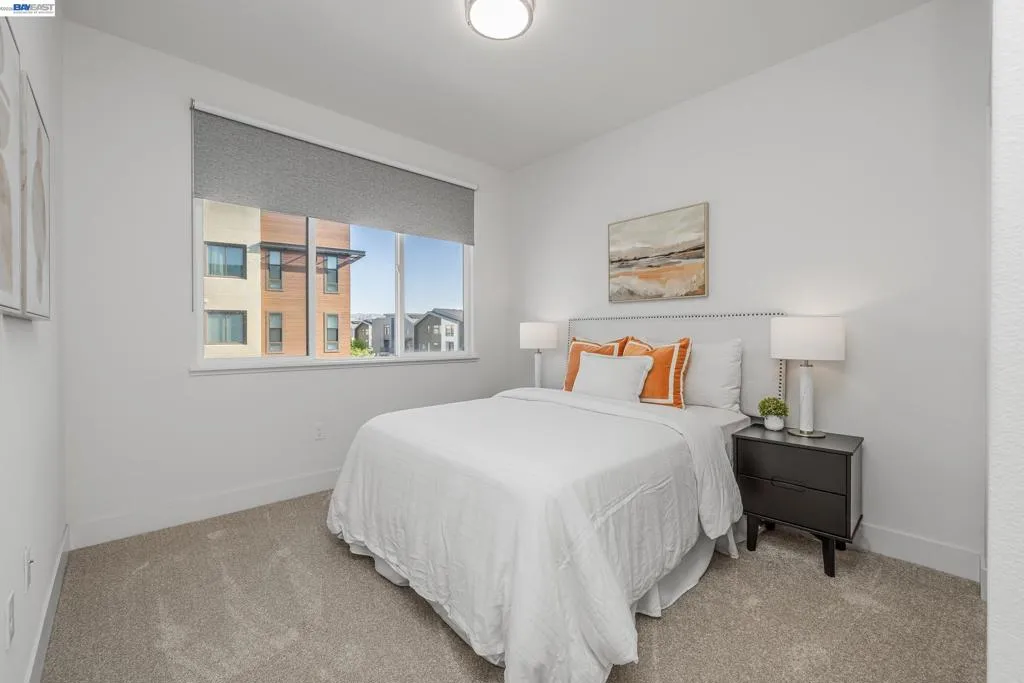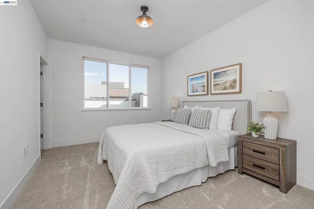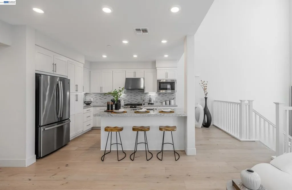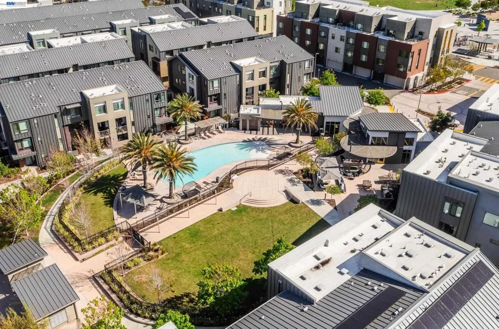Beautiful modern condo featuring 3 bedrooms & 3 full bathrooms, plus a media or office room upstairs. It offers 2,181 square feet of living space with high ceilings and abundant natural light. The open-concept layout flows seamlessly from the spacious great room to the chef-inspired kitchen, which includes an oversized island ideal for entertaining guests. The kitchen is equipped with stainless steel appliances. Recessed lighting is present upstairs and downstairs. Bedrooms and stairways have brand-new carpets. Features include a tankless water heater, owned solar panels, and dual-pane windows. There is also a laundry room and an attached 2 car tandem garage. Resort Style Amenities include a Fitness Center, Heated Pool with Cabanas, Clubhouse, BBQ areas, and parks. The location is close to BART, Highways 680 & 880, shopping, and major tech campuses, making commuting easier.