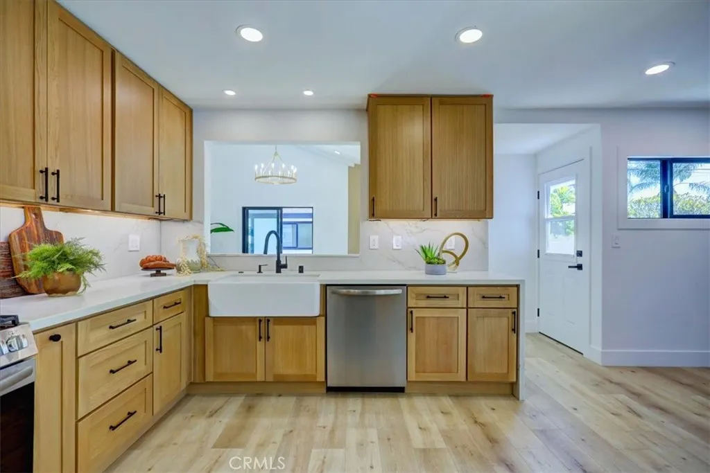 Situated on a quiet street in Long Beach, this fully remodeled home offers a functional layout with modern updates throughout. A single long driveway leads to a gated, detached two-car garage. The property features new exterior paint with black trim, manicured lawn with updated landscaping, a new front door, and an inviting front porch. Inside, the home showcases new flooring, fresh interior paint, new windows, and recessed lighting. Upon entry, the home opens to a formal living room that flows seamlessly into a formal dining area, both enhanced by large windows for natural light. The dining space connects directly to the spacious kitchen, which features brand-new appliances, abundant cabinetry, light countertops, and a matching backsplash. A laundry area is located adjacent to the kitchen. A pass-through window from the kitchen overlooks the family room with higher ceilings, a fireplace, a modern chandelier, and sliding glass doors leading to the backyard. The outdoor space has been newly landscaped and includes concrete stepping stones to a covered seating area with lattice detailing. An additional flex room off the garage provides versatile use and offers direct access to the backyard and garage. A hallway off the entry area leads to two well-sized bedrooms with closet space and an updated full bathroom featuring mosaic tile flooring, a remodeled shower, and modern fixtures. The primary bedroom offers ample space, additional closet storage, and an ensuite bathroom with a glass-enclosed shower, marble flooring, dual vanity, and skylight. Both bathrooms include smart toilets. Black fixtures throughout the home complete the modern aesthetic. This turnkey property combines updated finishes, indoor-outdoor flow, and practical living spaces in a desirable Long Beach location
