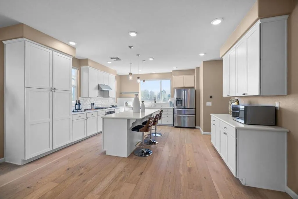 Rarely available corner/end-unit townhome offering exceptional privacy, abundant natural light, and a highly functional layout in a well-maintained, centrally located Milpitas community. This beautifully upgraded residence stands out for its modern finishes and thoughtful design. This thoughtfully designed home features a bedroom and full bath on the first level, ideal for guests, extended family, or a private home office. The main living area showcases a spacious open-concept layout anchored by a huge gourmet kitchen with an impressive 7-foot island, perfect for entertaining and everyday living. Modern enhancements include a whole-home water filtration system, multi-zone HVAC with Nest thermostats on each level, and numerous quality upgrades throughout. Upstairs, the luxurious primary suite offers a designer accent wall, expansive walk-in closet with custom built-ins, and a generously sized spa-like bathroom. Garage pre-wired for a 220V EV charger. Ideally located near neighborhood parks, shopping, dining, and top-rated schools. Easy access to major freeways including 880, 680, and 237. HOA amenities including ample guest parking, two parks, BBQ areas, and a children's play area enhancing everyday living. A perfect combination of location, layout, and lifestyle.