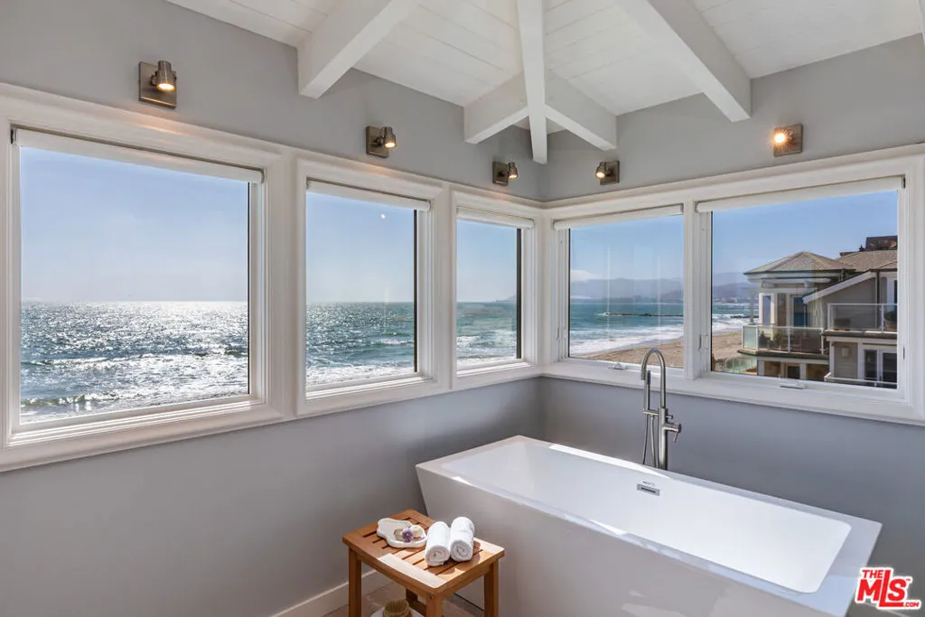 Welcome to 1448 Nathan Lane - arguably the most compelling oceanfront opportunity on the market today. Perfectly situated at the very edge of the Pacific in Ventura's highly sought-after Pierpont enclave, this home offers 86 feet of front-row access to the beach, unobstructed views of the Channel Islands, and a level of design and livability rarely seen on the coast. Set on a quiet, private lane with direct beach access, this fully updated architectural home is move-in ready and masterfully crafted for both elevated entertaining and everyday luxury. Soaring ceilings and floor-to-ceiling windows flood the space with natural light and frame breathtaking ocean views from nearly every room. From the moment you walk in, the coastline becomes part of the home's experience. The main level offers seamless flow between living, dining, and lounge areas - all oriented to maximize the stunning water views. A built-in wet bar, breakfast nook, and open-concept layout make this home feel effortlessly luxurious. The spa-like primary bath - complete with a soaking tub and glass-enclosed shower - is surrounded by wraparound windows so you can enjoy sunset views from your bath. And with your own private sauna and ocean-view fire pit lounge, every day here is a vacation. Step out onto one of several ocean-facing decks or head straight down to the sand - this property sits just steps from the waterline with no boardwalk or foot traffic between you and the beach. Whether you're entertaining on warm summer nights or enjoying a peaceful morning, the indoor-outdoor lifestyle here is second to none.
