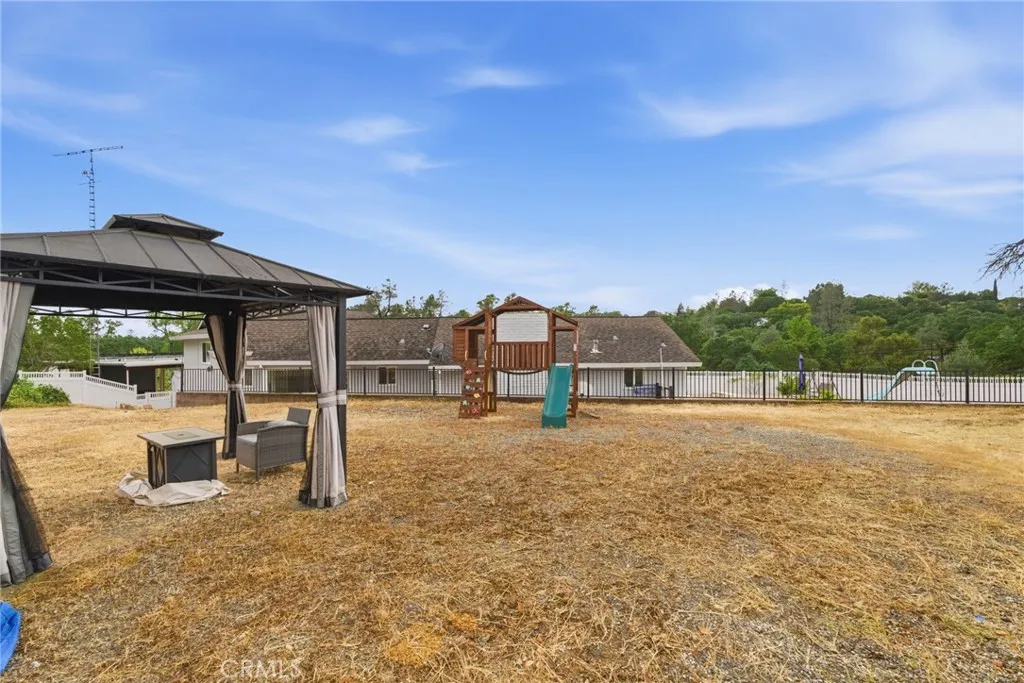 Experience the perfect blend of space, versatility, and resort-style living in this beautifully designed tri-level home, complete with owned solar and an entertainer’s dream backyard. Tucked into a peaceful, private setting yet just minutes from shopping, dining, and the scenic Oroville Lake & Dam, this property offers the ideal balance of seclusion and convenience. Step inside to a light-filled living room featuring soaring cathedral ceilings, a cozy fireplace, and dual sliding glass doors that seamlessly connect indoor and outdoor living. The backyard is truly a showstopper—highlighted by a large in-ground gunite pool with a diving board, slide, and play structure, plus a charming gazebo perched above. A built-in BBQ area and a dedicated poolside bathroom with a tile shower add both comfort and convenience for effortless entertaining. The kitchen is both functional and inviting, offering tile countertops, a breakfast nook, a walk-in pantry, and included stainless steel appliances. Just off the kitchen, a private lower level provides a flexible retreat, featuring the primary suite along with an additional room, perfect for a home office, gym, or nursery. With its own separate entrance, this space is well-suited for multigenerational living or added privacy. This level also includes a spacious laundry/utility room and direct garage access. Upstairs, you’ll find three generously sized bedrooms with ample storage, including one with direct access to a bathroom, ideal for guests or extended family. Additional highlights include a 3-car garage, covered carport with RV access and hookups, and an attached storage unit with a loft for even more functionality. The fully fenced property is enhanced with new vinyl privacy fencing, offering both security and peace of mind. Whether you're hosting gatherings, enjoying sunny pool days, or unwinding under the stars, this property is designed for easy, everyday living with room to enjoy it all.
