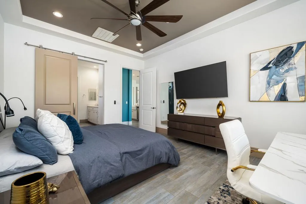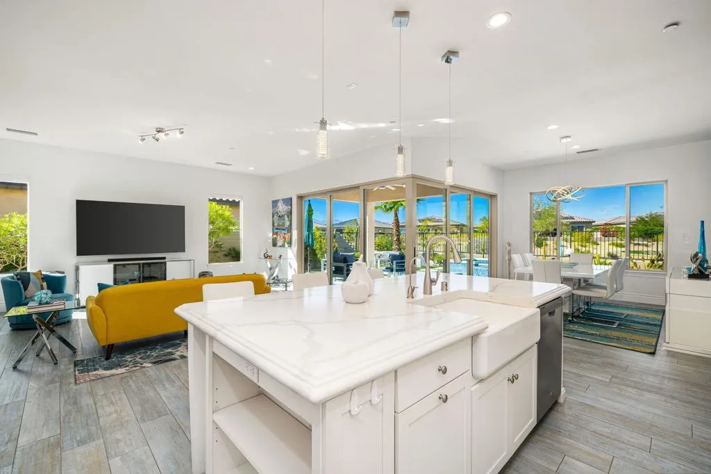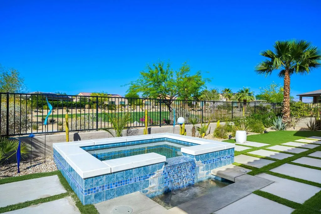 Must-see, move-in ready expanded Sanctuary Plan 4 located in the highly desirable Del Webb Rancho Mirage community. Bought in 2024 and lightly lived in, this home shows light and bright and is offered furnished per written inventory. Ideally situated on an interior lot backing to a walking trail with mountain views and close proximity to the clubhouse.Designed for seamless indoor/outdoor living, the home features an upgraded multi-panel corner sliding glass door system opening to a covered patio and private in-ground pebble-finish spa with spillway.The upgraded kitchen includes an executive island with quartz countertops, farm sink, custom backsplash, pendant lighting, 42'' upper cabinets, and a walk-in pantry. Wood-look porcelain tile flooring runs throughout the home.The primary suite offers a bay window, tray ceiling, and custom barn door leading to the bathroom with dual sinks, custom shower, and walk-in closet with solar tube. The guest bedroom is located at the front of the home for added privacy. Additional features include a den/office with glass French door and a separate laundry room with washer/dryer, upper cabinets, and solar tube.Energy-efficient upgrades include an OWNED SOLAR SYSTEM and tankless water heater and water softener system. Enjoy resort-style living with access to Del Webb Rancho Mirage amenities. Residents enjoy a state-of-the-art clubhouse, resort style pool and spa, fitness center, tennis and pickleball courts and a vibrant social calendar. HOA dues include cable & internet, adding even more value to this exceptional home. A move-in ready opportunity offering comfort, style and the very best of desert resort living.