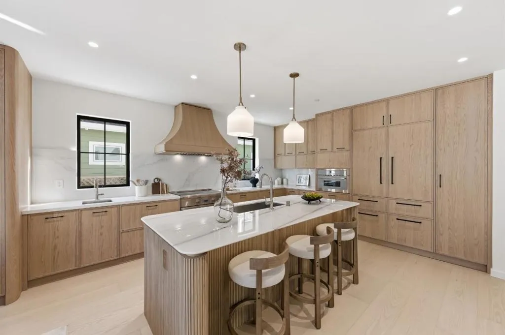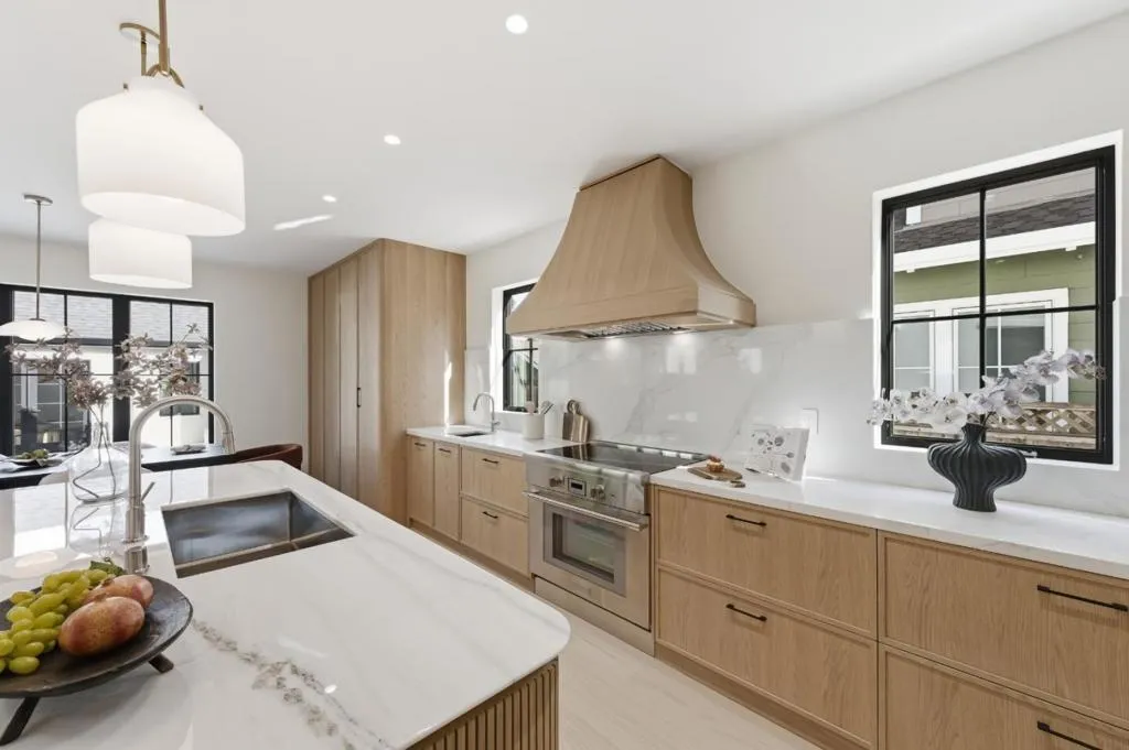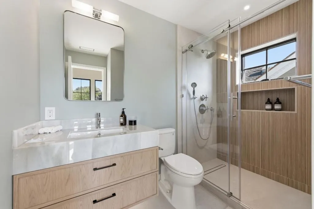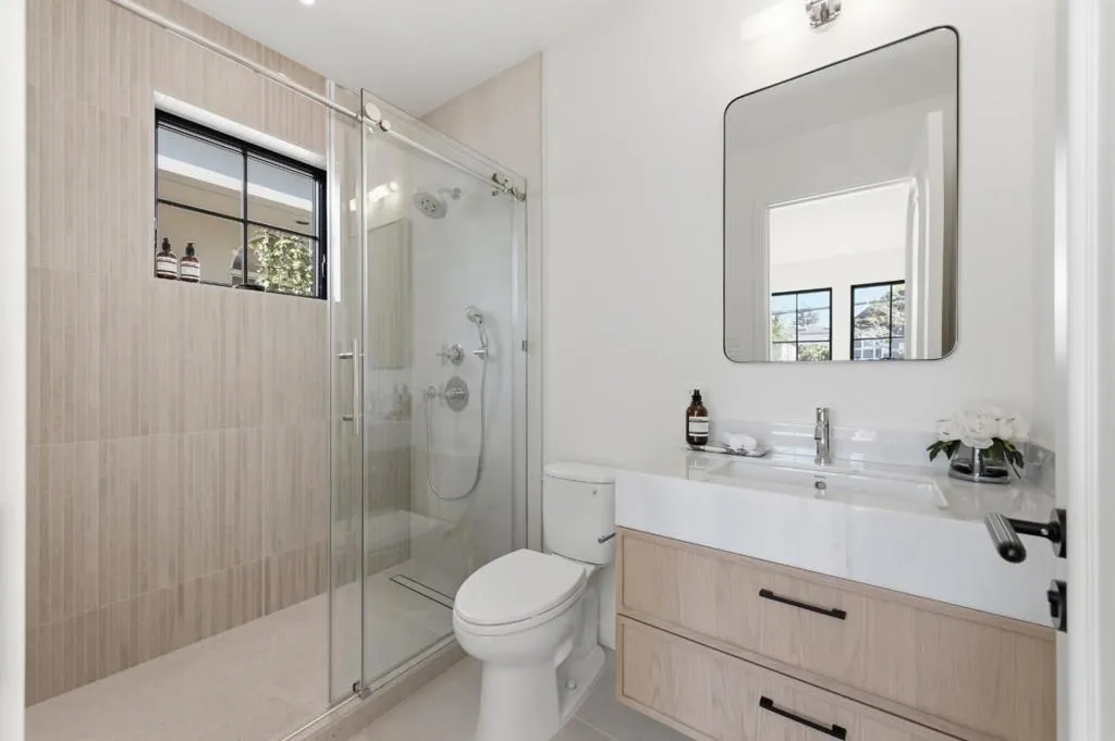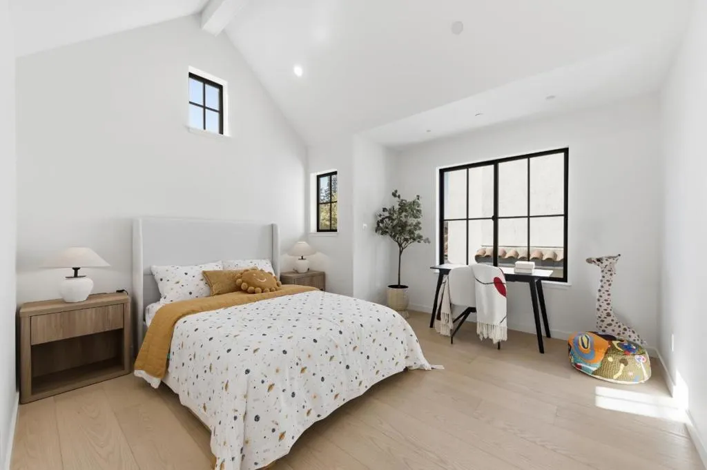 Rare find brand-new construction home in one of Burlingames most desirable neighborhoods, offering TOP RATED schools and a quiet residential setting. This thoughtfully designed primary residence features 2,658 sq ft, 4 bedrooms plus an office/den, and 4.5 bathrooms, including a convenient main-level ensuite, complemented by a detached 388 sq ft ADU with a full kitchen and bath, ideal for guests, a home office, or multi-generational living. Designed with both elegance and functionality in mind, the open-concept living space is centered around a sculptural curved marble island, complemented by custom cabinetry with premium German Blum hardware, a full Thermador appliance suite, integrated refrigerator, and a two-zone wine cooler. The marble fireplace adds warmth while maintaining a refined, modern aesthetic.Upstairs, three ensuite bedrooms offer privacy and comfort with vaulted ceilings. The primary suite includes a sitting area and a custom walk-in closet, while additional bedrooms feature built-in closets with integrated lighting. The home has been fully rebuilt with new foundation, electrical, plumbing, HVAC, windows, owned solar, and engineered white oak flooring throughout. Rare opportunity to own a thoughtfully designed new construction home in Burlingame. MUST SEE!