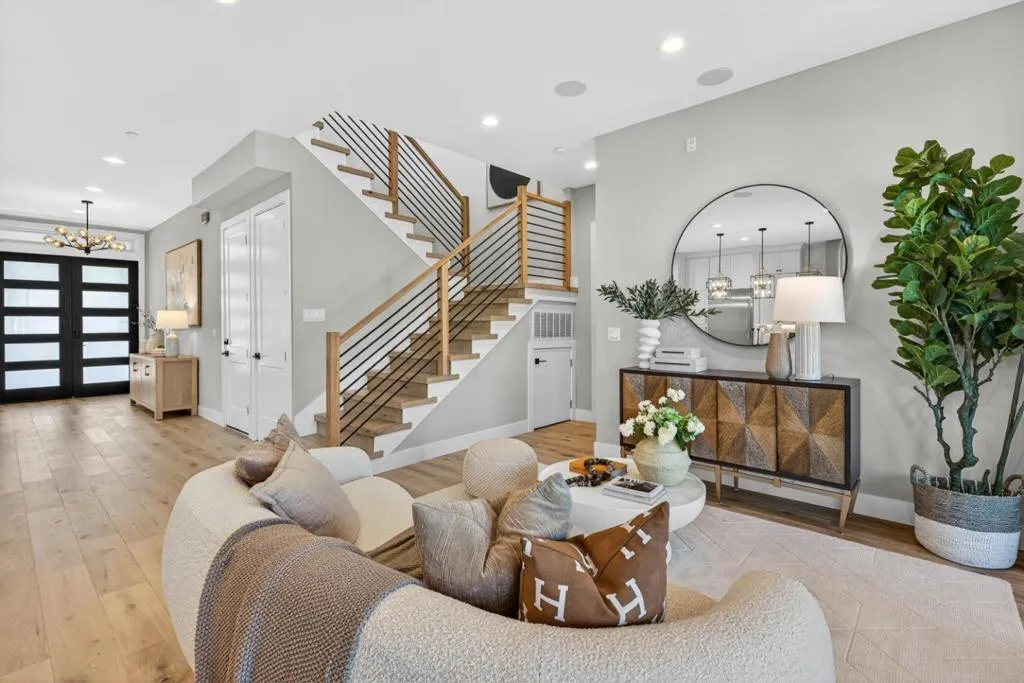 A newer 2024 modern home in the heart of Cupertino, ideally located near Cupertino Main Street and Apple Park, and zoned for top-rated schools including D. J. Sedgwick Elem., Hyde Mid., and Cupertino High. This thoughtfully designed residence features an open-concept layout with 10-ft ceilings on both floors, expansive Andersen windows, a dedicated office, bay window seating, custom cabinetry, and ample storage. The kitchen boasts premium Thermador appliances, a double waterfall island, full-height cabinetry, Grohe fixtures, tile backsplash, & a wet bar, with seamless access to a covered patio for indoor-outdoor living. The primary suite offers a private balcony and spa-like bath with freestanding tub, dual vanities, skylight, and glass-enclosed shower. Additional highlights include a modern staircase, recessed lighting, built-in speakers, security system, and PoE wiring. The home is fully electric with owned solar, heat pump systems, 3 HVAC zones, & dual EV charging. The landscaped yard features a paved driveway, mature greenery, & irrigation system. Includes an ADU, ideal for guests, in-law, separate working space, or rental.