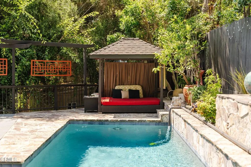 A Private Designer's Retreat in the upper Alta Canyada neighborhood of La Canada Flintridge! Tucked behind a balinese gated entry and enveloped by majestic deodar trees, this sprawling 4 bedroom, 3.5 bathroom estate is an inspiring private oasis. With a lineage of interior designers as past and present owners, the home is an intentional masterpiece--where every room and outdoor space is a curated blend of style, comfort, and creativity. Colorful design moments fill the home with life, while abundant skylights and solar tubes bring in soft, natural light, adding dimension and warmth to every space. And beyond beauty, there's peace of mind: the current owner has installed a rare and thoughtful permanent copper rooftop sprinkler system powered by gas. It operates on house water during high-risk periods and automatically switches to draw from the pool in case of evacuation, offering enhanced fire preparedness. This home offers a convenient floor plan with an indoor-outdoor flow of common rooms in the center and two bedrooms on either wing. The bright eat-in kitchen offers high-end appliances with new Sub-Zero refrigerator, dishwasher, and wine fridge. A generous sized dining room with mirrored textured and paper covered walls, chandelier, skylights and French doors to the backyard. The custom designed living room features a fireplace, tin ceiling, reclaimed wood built-ins and collapsible doors to the outdoors. Designed for both solitude and inspiration, the property features tranquil outdoor living areas and a sparkling pool, making it ideal as an artist's retreat or entertainer's delight. Beyond the expansive patio lies a backyard designed for exploration - meandering paths, mature trees and natural landscaping perfect for imaginary play, tree climbing, and peaceful adventure. It's a rare setting that invites both children and adults to connect with nature. A two car attached garage with an abundance of attic storage and parking as the property is 180 feet wide. Additional upgrades include new windows, HVAC, new laundry, repiped copper plumbing, electrical updates, tankless water heater, new irrigation, whole house soft water system, security cameras, pool equipment, remodeled bathrooms and much more. Whether you're seeking serene privacy, safety or award winning La Canada schools, this one-of-a-kind retreat delivers on all fronts!