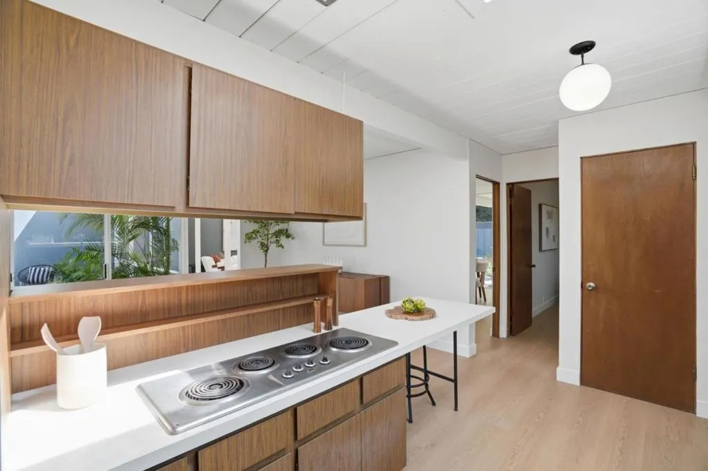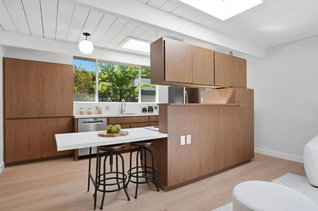 Located in Sunnyvales popular North Cumberland neighborhood and walking distance to Cumberland Elementary, this late built atrium model Eichler features a unique horizontal pitched roofline over the front bedroom and back of the house over the living room. The open air atrium has a landscaped surround and offers three sliding door points of entry into the home. There is a harmonious flow between the living room and dining room, with a low brick fireplace defining the spaces and wall-to-wall panels of expansive glass all along the back side of the home. The kitchen features original wood cabinetry, original formica countertops and iconic built-in kitchen table. Adjacent there is a casual family room, as well as a walk-in pantry and spacious utility room. The primary bedroom has an ensuite bath and walk in closet. There are three additional bedrooms with a remodeled hall bath. The fourth bedroom has a dramatic vaulted ceiling with celestial windows and sliding glass door to the atrium, perfect for office or guest space. Radiant heating with new luxury vinyl plank flooring throughout. Idyllic location, just minutes to Sunnyvale Library, Las Palmas Park, Sprouts Market, Trader Joes, Whole Foods, Target, Cal Train, and downtown Murphy Ave shops, restaurants and weekly Farmers Market