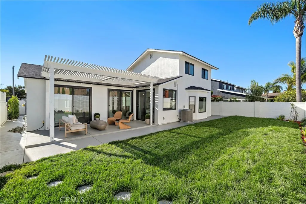 This Crisp Contemporary California Classic home has been beautifully remodeled and upgraded throughout! As you enter the massive private gated courtyard you are immediately impressed by the tranquil ambiance this home has to offer. Exceptional open concept living space affords the ultimate in relaxed elevated living. Rich white oak premium LVF plank flooring flows seamlessly throughout the residence. The kitchen is an absolute showstopper with a massive center island with waterfall edge detailing. Sleek Malaysian Calcutta Veneta Quartz counter tops allow for ample counter space. The rich modern cabinetry is custom built with soft close features. High end appliances including Sub Zero Refrigerator, Thor restaurant grade range and Bosch dishwasher. Full quartz backsplash with pot filler and beverage cooler completes the space. The primary suite is conveniently located downstairs and has a large walk-in closet with built in storage. The primary bath is spa like in design and offers a lovely soaking tub, walk in shower with designer selected tile and dual vanity and sink areas. Opulent sconce lighting and designer selected fixtures and fittings. The downstairs office is ample in size and can be utilized as a bedroom. If the buyer would like the seller will install a custom closet for the buyer. Upstairs you will find two additional generously sized bedrooms and another fully remodeled bath. The rear grounds of the property offer another large patio area and lush rolling lawns for you relaxation and entertainment needs. There are new black frame double pane windows and sliders and new window coverings. The roof is brand new and comes with a full warranty. There is a new electrical panel, new furnace, new water heater and new air conditioning unit. All work was done to code and fully permitted by the City of Huntington Beach. Come and enjoy all that Huntington Beach Coastal living has to offer in this truly turnkey home!