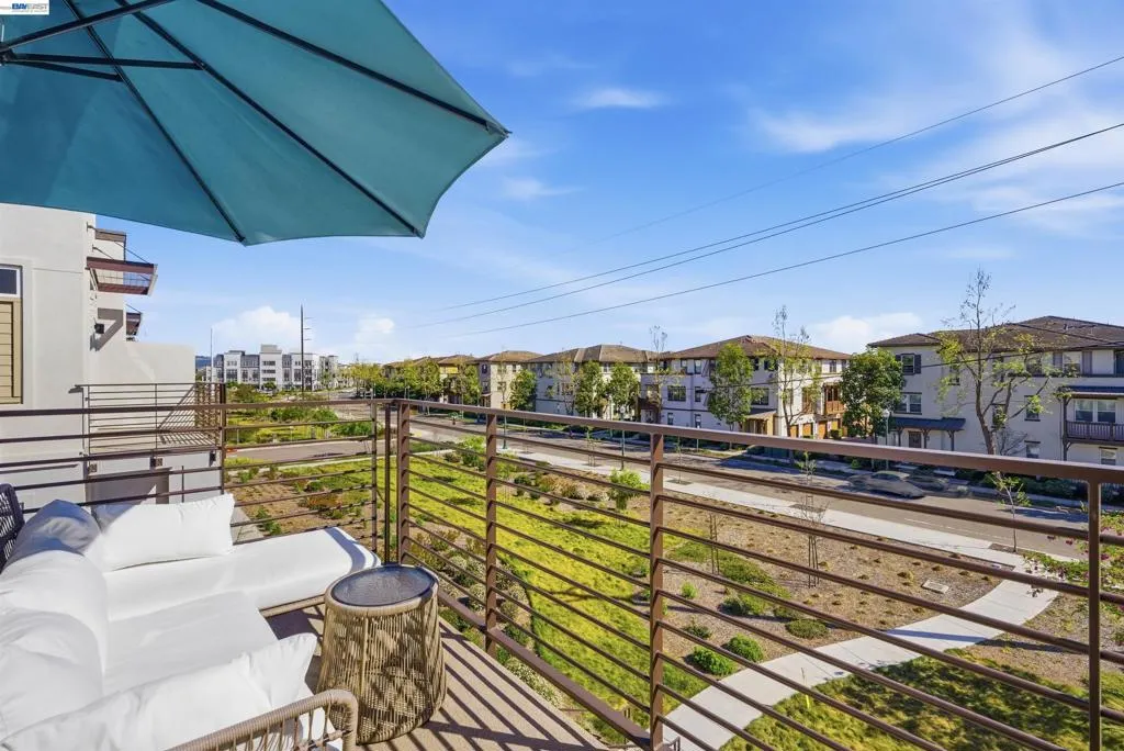 Experience the best of Alameda in this light-filled 2-bedroom, 1.5-bath townhouse-style condo in the desirable Bay37 waterfront community. Built in 2022 and beautifully maintained, this bright end unit offers windows on three sides with both sunrise and sunset exposures. The thoughtfully designed interior features a chef's kitchen with quartz countertops, a marble backsplash, an open living and dining area perfect for entertaining, and a private balcony great for unwinding with the sunset views. Upstairs, two sunlit bedrooms enjoy natural light and generous storage with custom closet systems, a spacious full bath, plus a second private balcony. Smart living is built in throughout: central A/C with three zoned digital thermostats, smart appliances, and premium window coverings. Both balconies and the front entrance open to a serene greenway, providing peaceful views and a sense of tranquility. The home is ideally located near Alameda Landing, with easy walking or biking access to retail. The location is truly exceptional—Bay37 is just steps from the Alameda waterfront with scenic walking trail, picnic areas, and a playground, with convenient access to transportation, including ferry to Jack London Square and SF. Enjoy waterfront serenity while staying connected to city life.