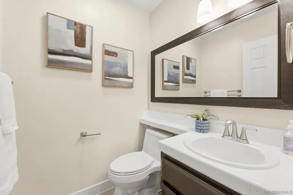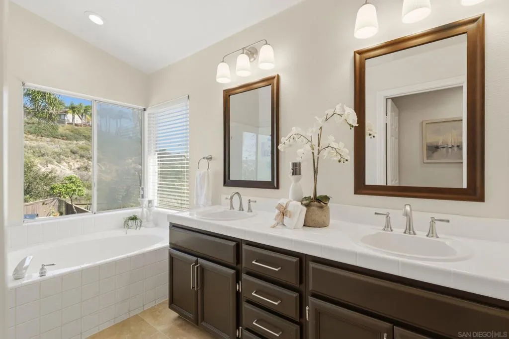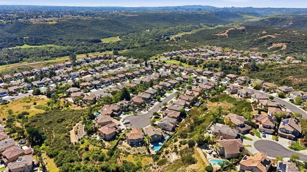 Tucked at the end of a quiet cul-de-sac, this 4-bed, 2.5-bath home delivers the San Diego lifestyle you've been dreaming of. Step outside and you're in your own private resort — a stunning pool and spa, built-in BBQ, gas firepit lounge, outdoor TV, and sweeping hillside views with no rear neighbors. The expansive paver patio was made for entertaining, and the bright, updated kitchen with white shaker cabinets and quartz counters keeps you connected to it all. This one checks every box. Come see why Park Village is home. Home Upgrades: Interior painted, 2025, New interior light fixtures, 2025, New interior door handles, 2025, New bedroom ceiling fans w/lights, 2025, New kitchen stove & microwave, 2025, New pool/spa equipment, 2022, New gutters and drains, 2022, Pool and backyard remodel: Pebbletech, addition of Baja step and umbrella stand, new custom coping, new mosaic tile in pool and spa, waterfall feature. Hardscape/landscaping: Redesign of backyard topography. Belgard pavers. New steel reinforced fence, hotel/industrial grade 5' steel fence around pool. Custom iron/wood gates at two points of front yard entry, custom pillars at entry way matching the pool coping, concrete wall enclosure at front of yard to connect gates to fence and form enclosure. Custom mosaic glass tile shower connected to pool plumbing. Exterior: Samsung Terrace TV (equipment, 20amp circuit install, specialized heavyweight mount & install), Chef fridge, BBQ w rotisserie, granite countertop at BBQ. New kitchen cabinetry and quartz countertops. Interior Flooring: Travertine & ceramic tile, carpet, laminate. Master and kid baths update to glass showers. Property line follows the line on both sides of the home all the way to the top or very near the top. A title report and plat map will confirm property lines. Garage epoxy flooring and custom storage and racking. Last but not least ... Pickleball court right out the front door in the cul-de-sac!