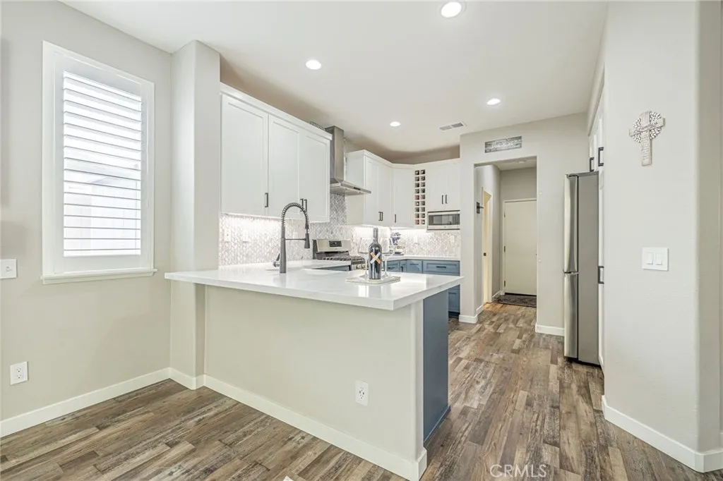 Welcome to this beautifully remodeled residence in the desirable community of Castaic, where thoughtful design meets elevated everyday living. This turnkey home offers 3 bedrooms, 2.5 baths, and a versatile flex space ideal for a home office, den, or guest room. The interior has been extensively upgraded with wide-plank luxury vinyl flooring throughout, complemented by a soft, neutral color palette that creates a warm and inviting ambiance. The fully redesigned kitchen is a standout feature, showcasing quartz countertops, custom shaker cabinetry, a marble backsplash, a Kohler farmhouse sink, built-in wine refrigerator with dedicated wine storage, and a custom range hood—perfectly blending style and functionality. All bathrooms have been tastefully remodeled with high-end finishes, including quartz and marble surfaces, custom vanities, designer tilework, and updated fixtures. The primary suite offers a spa-inspired retreat with a soaking tub and separate shower, creating a relaxing, resort-like experience. The living spaces are equally inviting, highlighted by a beautifully updated fireplace surround that adds warmth and a refined focal point. Additional enhancements include solid wood interior doors with sleek black hardware, custom shutters throughout, updated lighting at the entry and dining areas, and ceiling fans in each bedroom. A new custom sliding door opens to a serene, low-maintenance backyard designed for relaxation and entertaining, featuring ambient lighting, a shaded patio cover, raised planter beds with citrus, and spacious side yards with a garden shed for added functionality. Recently painted and meticulously maintained, this home offers a rare opportunity to own a truly move-in ready property with quality upgrades throughout.