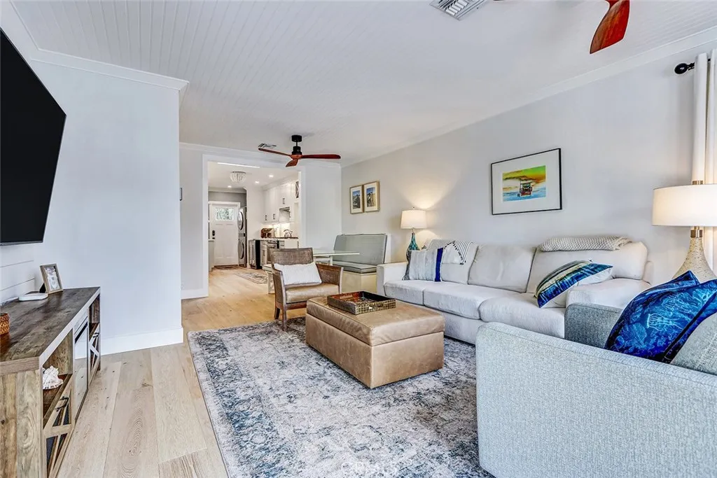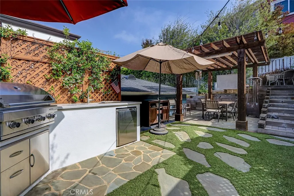 Tucked along a peaceful stretch of South Redondo, 517 Sapphire Street is a pristine beach cottage that radiates coastal charm and refined craftsmanship. Every inch of this immaculate home reflects thoughtful design—bright, balanced, and beautifully finished with magazine-worthy appeal. The living room welcomes you with a glass entry door and soft coastal textures. A beadboard ceiling and white slatboard accent wall add dimension, while ceiling fans keep the space cool on breezy days. Double French doors open to an elevated front deck, the perfect spot to enjoy ocean breezes and glowing sunsets—a seamless blend of indoor comfort and outdoor serenity. Wide-plank oak floors guide you into a sunlit kitchen where timeless design meets function. Quartz countertops, white shaker cabinetry above, and soft blue-green tones below create an elegant coastal palette accented by brushed gold hardware. A farmhouse sink, marble-and-mosaic backsplash, and skylight fill the space with light. High-end KitchenAid appliances, a beverage center, floating shelves, and a built-in dining nook make this kitchen both stylish and inviting. Both bedrooms echo the home’s relaxed sophistication, featuring crown molding, wide baseboards, and dual-pane windows for warmth and quiet. The primary bedroom embraces clean lines, while the west bedroom benefits from afternoon light. The bath is beautifully appointed with marble floors, a jetted soaking tub, and mosaic glass inlays that add subtle artistry. Step through the kitchen’s Dutch door to a private backyard designed for coastal entertaining. A custom pergola with retractable screens and built-in heater shades the outdoor kitchen, complete with stainless-steel BBQ, polished stone counters, and serving space. Tiered landscaping features low-maintenance turf, stone accents, and raised garden beds with a drip system. The gas fire pit—its flame flickering through glass rocks—sets the tone for relaxed evenings under the stars while a stone water feature adds the soothing sound of nature. Additional amenities include air conditioning, automatic sprinklers, a paver driveway, and a spacious two-car garage with extra storage. 517 Sapphire Street is a coastal retreat where craftsmanship, comfort, and California sunlight converge.