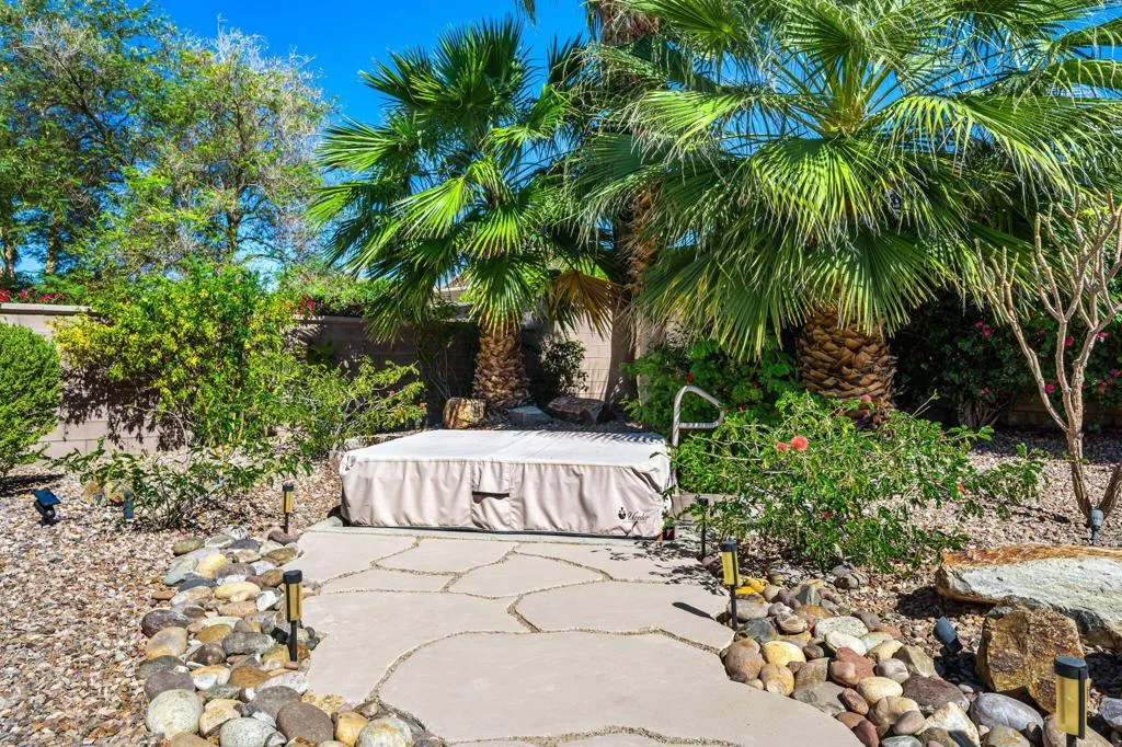 Do not miss this 2 Bedroom/2 Bathroom PLUS A DEN/OFFICE/FLEX ROOM popular ST. Maarten model! This particular home has an oversized lot, allowing for a large, lush and lovely outdoor experience. In addition to the lush landscaping and patio with an overhang, is an outdoor spa. Perfect for those desert evenings. The home is located in close proximity to Donny Lake and to the Lakeview Clubhouse ( pool/gym). Tile flooring runs throughout the main living areas. The Great room features a gas fireplace surrounded by stylish stacked stone. The kitchen has granite countertops, under-cabinet lighting, stainless steel appliances, a large pantry and pull-out shelving in the cabinetry. The THIRD ROOM is the BONUS! It has beautiful accordion doors for privacy and plantation shutters. The relaxing primary suite includes a bay window overlooking the beautiful yard, a media nook, a large walk-in closet and an en-suite bathroom with a sitting vanity and glass-enclosed shower. The guest bedroom also has a walk-in closet and shutters. The guest bathroom, with easy access from the entire home, features a tub/shower combination. Additional highlights include an indoor laundry room with built-in storage, a two car garage with ample storage and an AC installed in 2021.Come see what Desert Living offers in this elegant home.