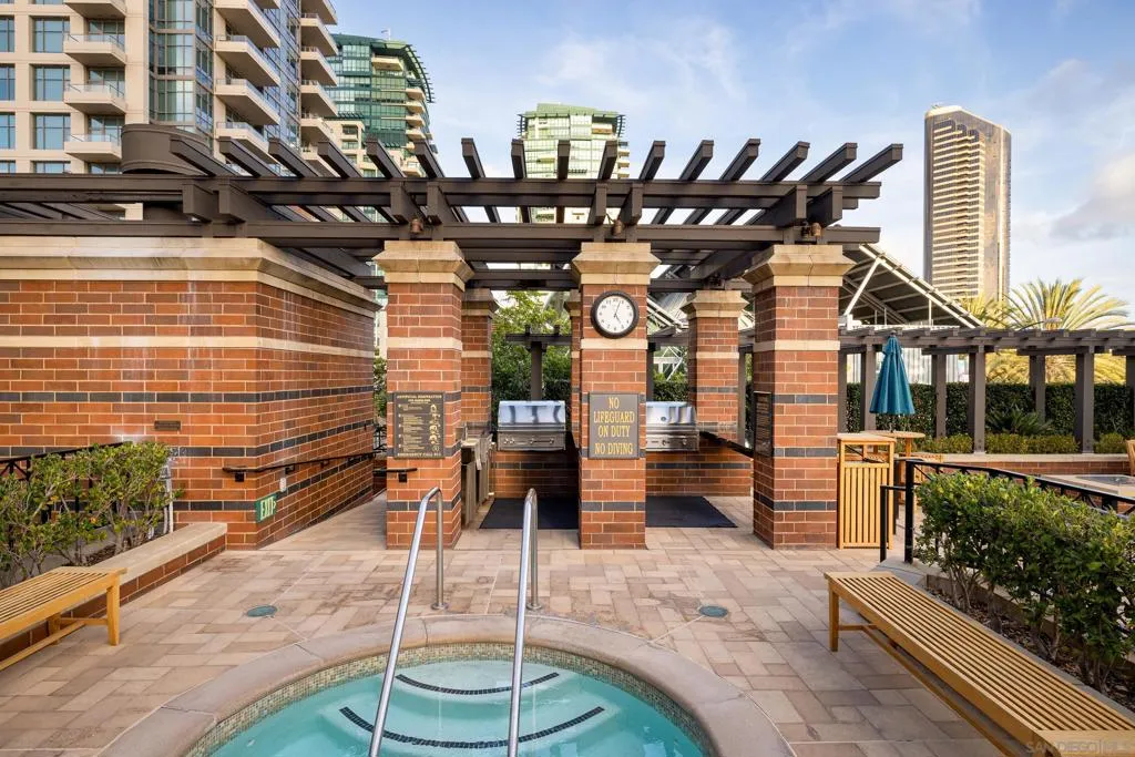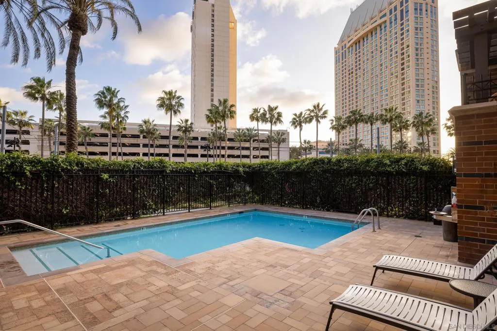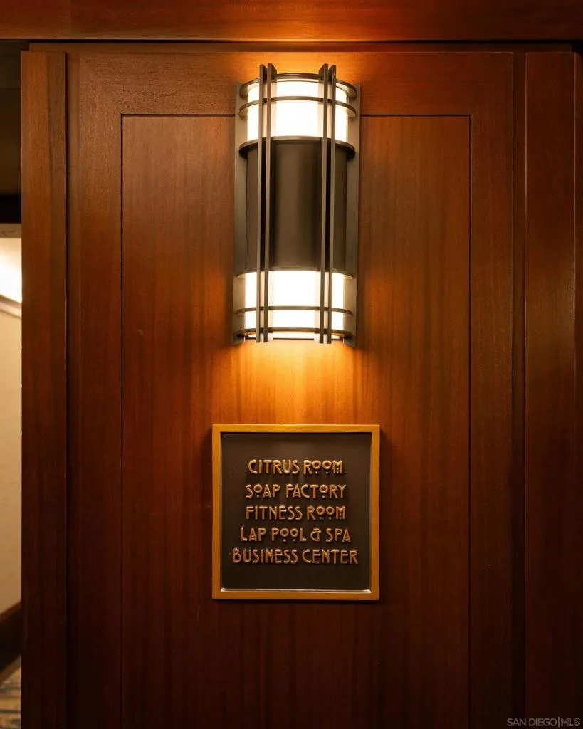Built in 1921, the Citrus / Pacific Soap Factory Building was designed by local San Diego architect William Wheeler. In 1993, architect Milford Wayne Donaldson completed CityFront Terrace. His design integrated a contemporary brick condominium building with the historic Citrus Soap Factory, making it one of the largest brick buildings on the West Coast. This loft residence is in the original, historically designated Soap Factory building, and is part of the Mills Act (which offers property tax incentives for historic preservation). The home features vaulted ceilings, hardwood flooring with original wood beams and brick accents throughout, an open kitchen with premium brand appliances and a reading nook in the second bedroom. Functional built-ins provide storage and working / desk space off the living room. The primary bedroom offers a spacious walk-in closet and a large bathroom with a separate bath & shower. The living room and both bedrooms have west-facing floor-to-ceiling iron-pane windows overlooking a lushly landscaped courtyard, known as the Urban Canyon, which hosts mature trees, vibrant greenery, and an artistic 90-foot water feature... The amenities at CityFront Terrace are resort-level, and the Soap Factory residences have the benefit of having everything right downstairs. From the jacuzzi and bbqs overlooking the 75-foot lap pool, to the entertaining suite with a full kitchen and bar for events and parties, a 3,500+ square foot fitness area with strength and cardio equipment, showers, saunas, and a workout studio, all of which share the historic aesthetic of the residences above. On the opposite side of the property, you will find an additional relaxing swimming pool and sundeck that lead out to a promenade with perfectly maintained landscaping. Additional conveniences include 2 assigned parking spaces with valet options, bike rooms, secure package and mail handling, and a 24-hour attended lobby with concierge services. You are just a few minutes' walk to San Diego Bay, Seaport Village, Pantoja Park, the Children's Museum and a number of restaurants and cafes, including Puesto, The Lion's Share, and Brickyard Coffee & Tea...