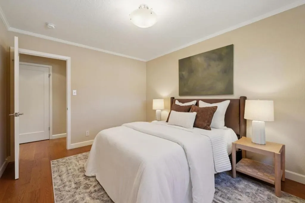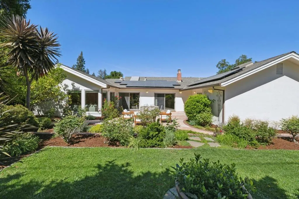 Prime location in North Los Altos! The front yard slate patio and the matching vegetation are a mastery of harmony. The reed glass entry doors signal the sophistication of the home. This home has a great floorplan and beautiful hardwood flooring throughout. The dining room on the right is perfectly situated for formal dining. The living room, with a wood burning fireplace, is large and flows to the back courtyard for in-and-out entertaining. An amazing skylight fills the kitchen with brightness. It has a spacious eat-in area that opens to the family room. High ceilings, floor to ceiling windows, and a charming pot belly stove make this family room really special. There is a lovely guest bath off the family room To the left of the entry is the bedroom wing that comprises 3 good sized bedrooms with fitted closets & served by a hall bath. The primary suite has a large dressing area with closets and a granite vanity. The oversized shower has floor to ceiling stone tiled walls and a seat. The backyard has a beautiful flagstone courtyard surrounded by mature roses. Step up to a lovely lawn and a grove of mature citrus trees. The solar panels and the heat pump system make this home energy efficient. Ideally located in this prestigious neighborhood, this home is a delight to behold.