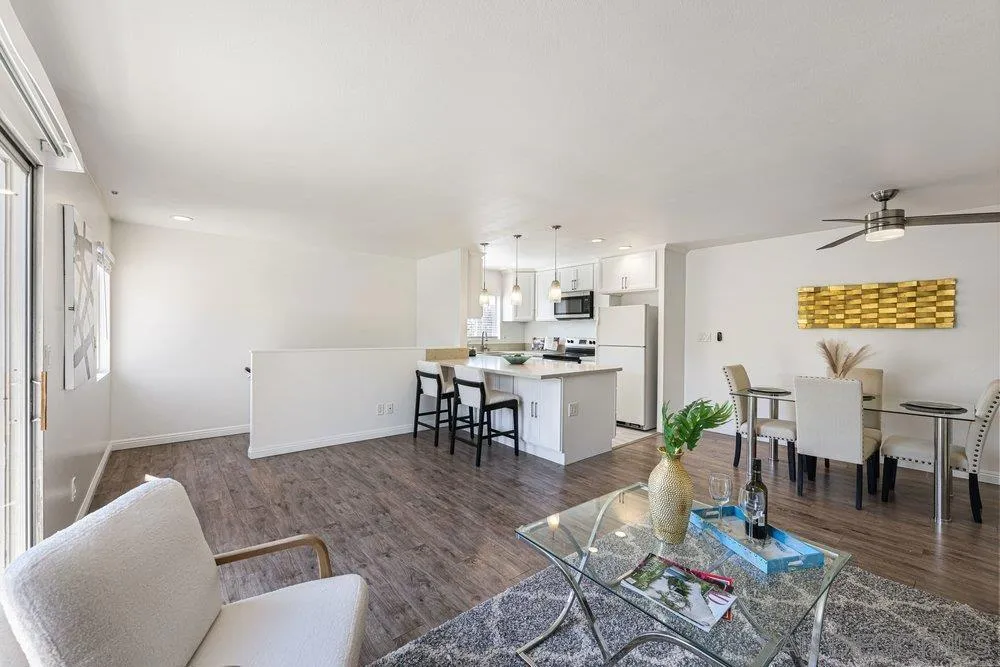 Spotless Turn Key ready 2Bd/1Ba townhouse in the heart of PQ. Fully remodeled upstairs unit with SE exposure floods the open floor plan with natural light. Well sited in a quiet and elevated part of the complex.. Deep Peninsula island anchors the Heart of the home, and makes entertaining a delight! Amazing kitchen with lots of storage, quartz counters, dishwasher, SS appliances. See SUPP for more details… Fresh paint * Laminate and tile floors* ceiling fans * in-ceiling lights * in-unit laundry * custom bathroom and shower * spacious closets with mirrored doors * shared garage! Walk to Poway Unified schools, shopping, restaurants, EZ freeway access and short 15 min drive to the beach to enjoy breathtaking daily sunsets.. Make this cozy house YOUR HOME today!