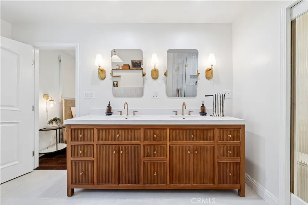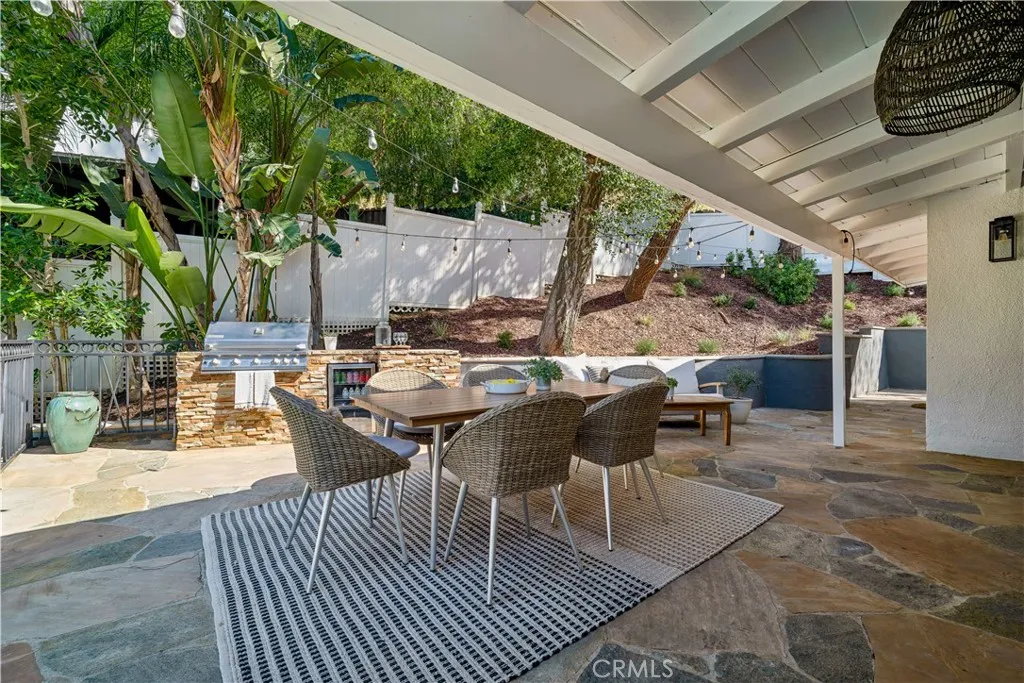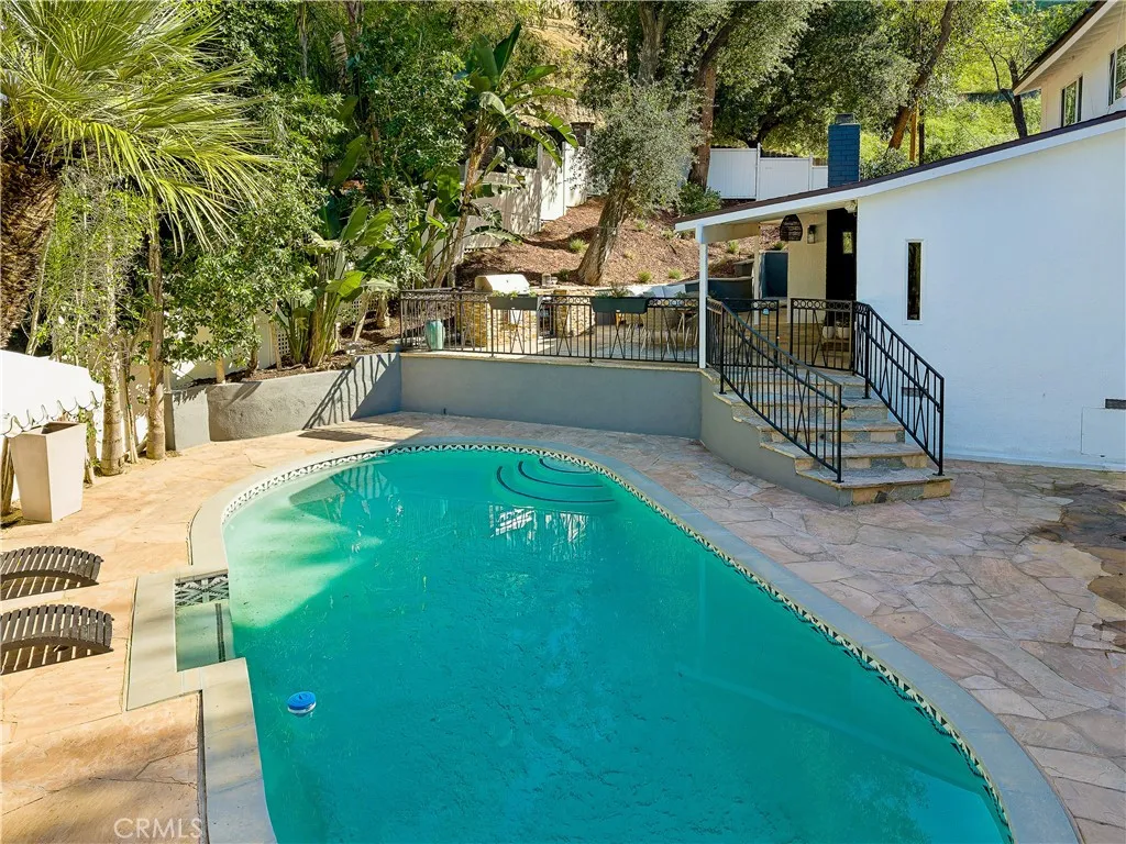 South of the Boulevard | Pool Home on One of Woodland Hills' Quietest Streets This is the kind of Woodland Hills property that doesn't come along often — a flat corner lot, a year-round pool, and a location south of the boulevard that feels worlds away from the noise while keeping everything within easy reach. This 3-bedroom, 2.5-bath home offers 2,470 sq ft of living space that balances warmth, privacy, and thoughtful upgrades throughout. Lots of this size with a pool are something special in Woodland Hills. The manicured grounds feature updated landscaping, a full irrigation system, and a backyard built around outdoor living. Perfect for summer and cool winter evenings alike, the gas-heated pool anchors the space alongside a covered patio, built-in BBQ, built-in refrigerator, and mature trees that create a resort-like atmosphere without sacrificing light. The upgraded half bath opens directly to the patio — a thoughtful touch that keeps wet feet from ever entering the house. Parking is abundant: 2-car garage, 4 driveway spaces, and a dedicated uphill pad bring the total to 8 — rare in an area where narrow streets make parking a challenge. Inside, skylights, vaulted ceilings, and an open flow keep the home remarkably bright despite the surrounding tree canopy. The family room impresses with crown molding, wood flooring, recessed lighting, and a gas fireplace, with surround sound extending through the first floor, home theater, and patio. The custom breakfast nook with built-in storage, Sunbrella cushions, and Rejuvenation hardware elevates everyday moments from sunlit morning breakfasts to casual evening dinners. The primary suite occupies its own floor, anchored by a completely transformed bath — Emser tile, solid teak vanity, quartz countertops, California Faucets, multi-head shower, and Kohler x Studio McGee mirrors and lighting. A new RHEEM 5-ton high-efficiency HVAC and owned solar panels mean you can run the AC and enjoy the pool without watching the meter. Additional upgrades: custom blackout Roman shades, custom electronics cabinet, Ring and Arlo security, and new light fixtures throughout. Pre-inspected and move-in ready: roof repairs completed, termite Section 1 cleared, septic cleaned and treated. Inspection report and disclosures available upon request. The quiet street, the flat lot, the year-round pool, the privacy — individually each is hard to find in Woodland Hills. Together, they make this one truly special.