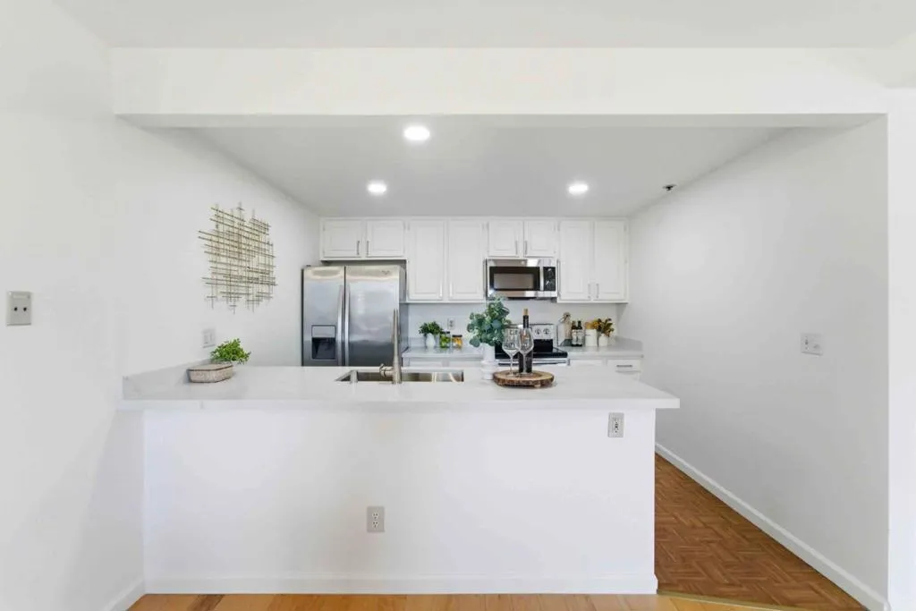 Stunning and Largest unit you will find under $850K. 1456 sq feet is larger than some surrounding single family homes. This one story unit in gated community with an elevator is the perfect "Roommate Floorplan"- with beds and baths on opposite sides of the unit. Fabulous sought after open concept allows interaction from in kitchen with quartz counters to living & dining rooms. Freshly painted and recessed lights creates a modern vibe. Large windows allows natural light and spacious terrace offer views you can enjoy from a high floor. Primary bedroom is approximately 15' by 11' and offers plenty of room for an office space or work out area. Primary bath has dual sinks with elegant quartz counter, large closet & bathtub/shower. Secondary bedroom is a massive 17' by 11' with bay window & walk in closet. Guest bath has quartz counter & large soaking tub. Intelligent design means no shared walls. Other extras: brand new AC ($12K to install), Full size Washer/ Dryer, Refrigerator, storage closet, elevator, 2 parking spaces, trash chute, low Santa Clara utilities and packages delivered to your door! HOA covers a ton! Hot and Cold water, swimming pool, rec room with PING PONG :-) and pool table. Easy commute to Apple, Nvidia. Enjoy the peace that a high floor offers.