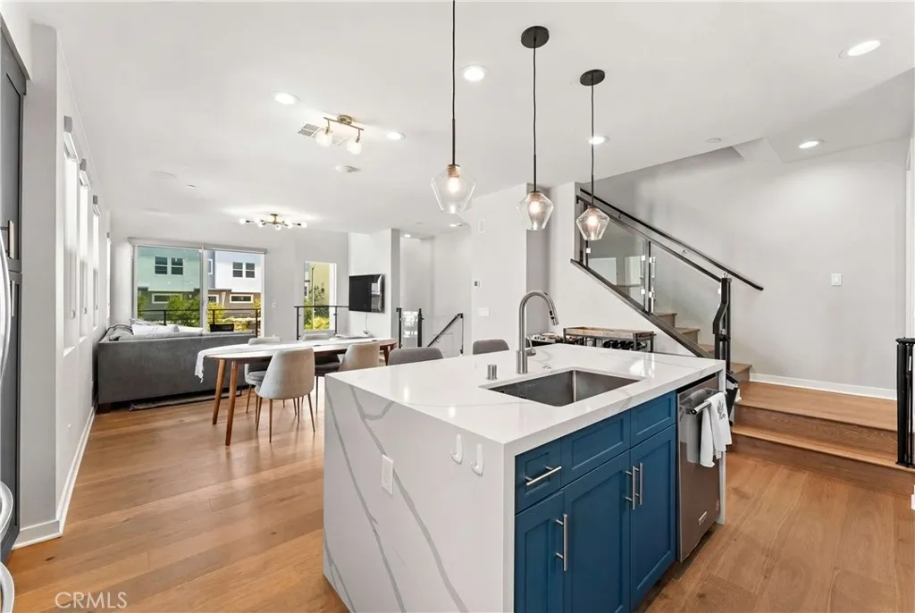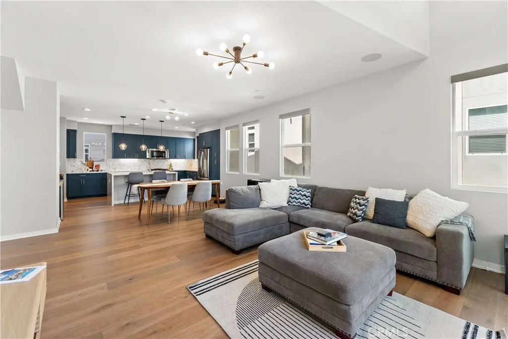 Welcome to a thoughtfully upgraded, light-filled end-unit in the highly sought-after 3Roots community, featuring over $100,000 in premium enhancements, including fully owned and paid-off solar. The home blends modern design with everyday functionality, showcasing wide-plank engineered wood flooring, designer paint, recessed lighting, and integrated Sonos speakers throughout the living room. The kitchen is a true focal point, anchored by a waterfall-edge quartz island, custom pull-out pantry drawers, a touchless faucet, and elevated finishes. A private entry-level bedroom with a full bath and direct access to the attached two-car garage offers flexibility for guests or a home office. The primary loft features an additional bonus area ideal for an office, nursery, or workout space, along with custom California Closets and backlit mirrors that add a polished, high-end feel. Built by Shea Homes as the Atwood floorplan, this residence is part of the vibrant 3Roots community, where residents enjoy access to a state-of-the-art fitness center, pools, parks, and a dynamic community hub, all just minutes from top dining, shopping, and coastal access.